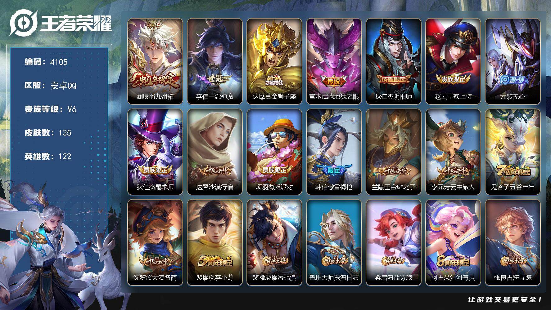 安卓Q-V6-尊贵铂金II段位-122英雄-135皮肤-4传说-33史诗【英