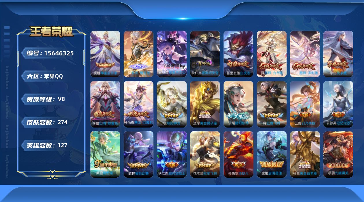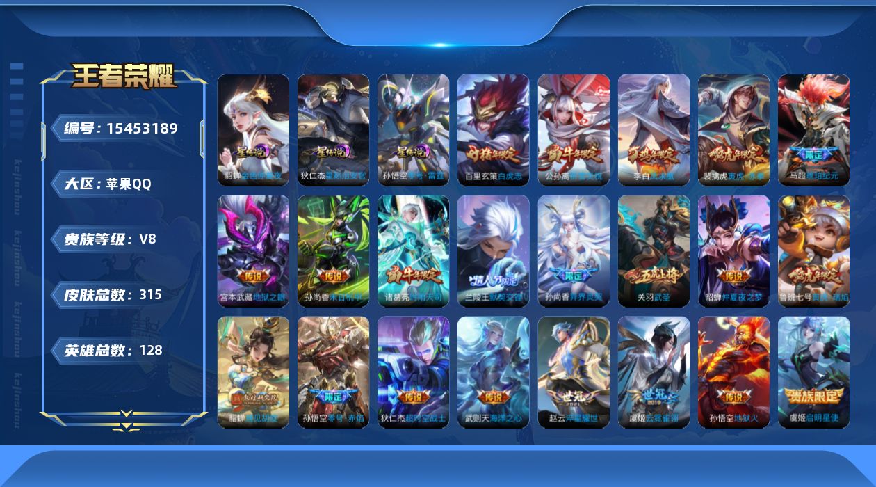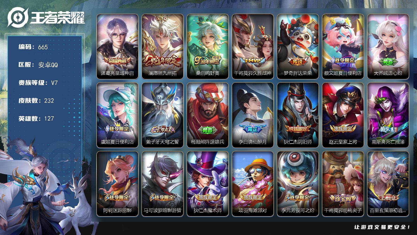 安卓Q-V7-永恒钻石I段位-127英雄-232皮肤-1典藏皮肤-4传说-60