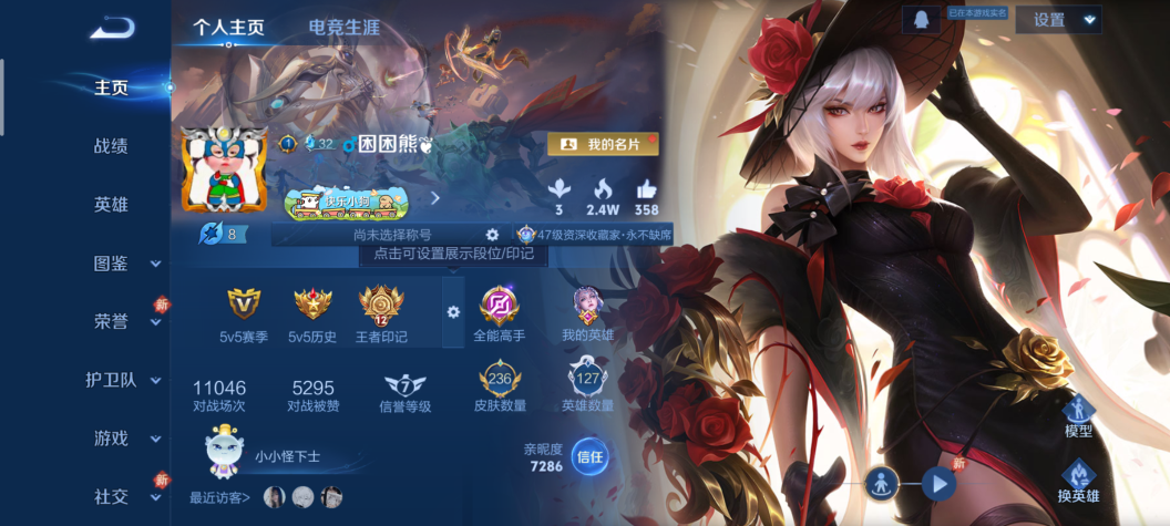 实名: 可修改 贵族等级: V5 英雄数: 125 皮肤数: 160 星传说: