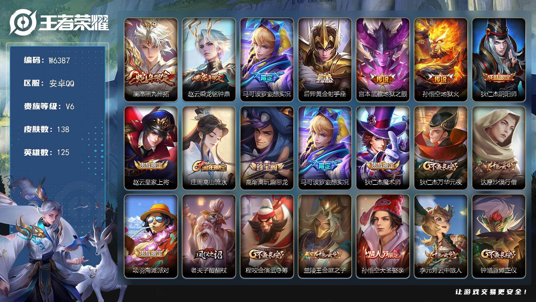 【W6387】安卓Q区-可二次-贵7-125英雄-138皮肤-6传说-35史诗