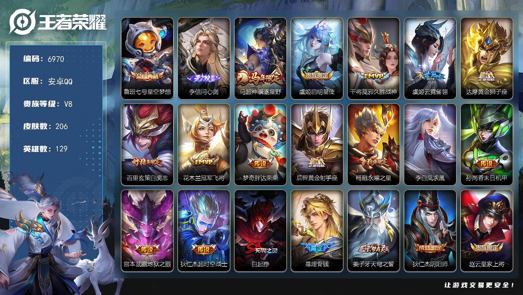 贵族8/皮肤206/典藏1/传说14/史诗61/英雄129/孙权全皮/敖隐全皮/