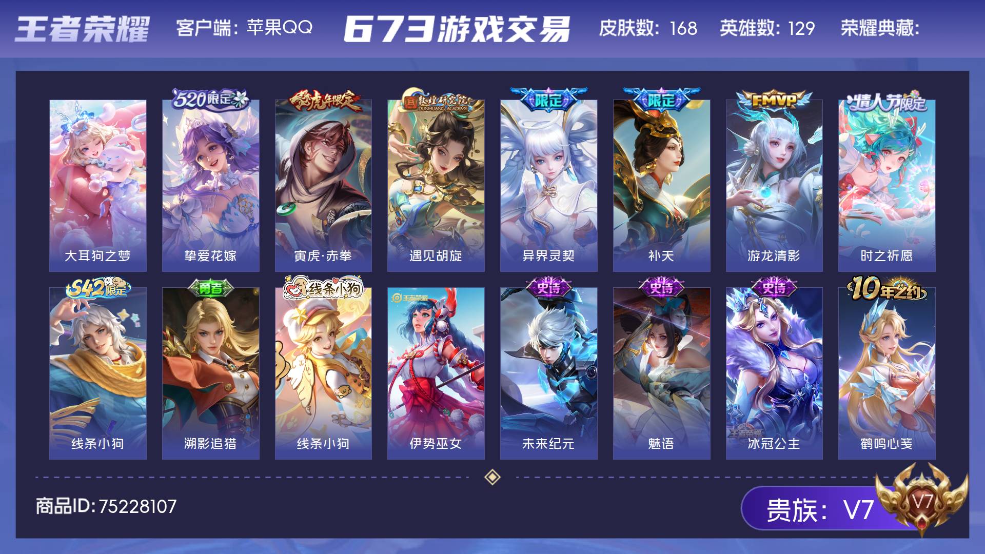 V7 皮肤168 英雄129 永恒钻石 珍品传说1 传说7 其他皮肤165