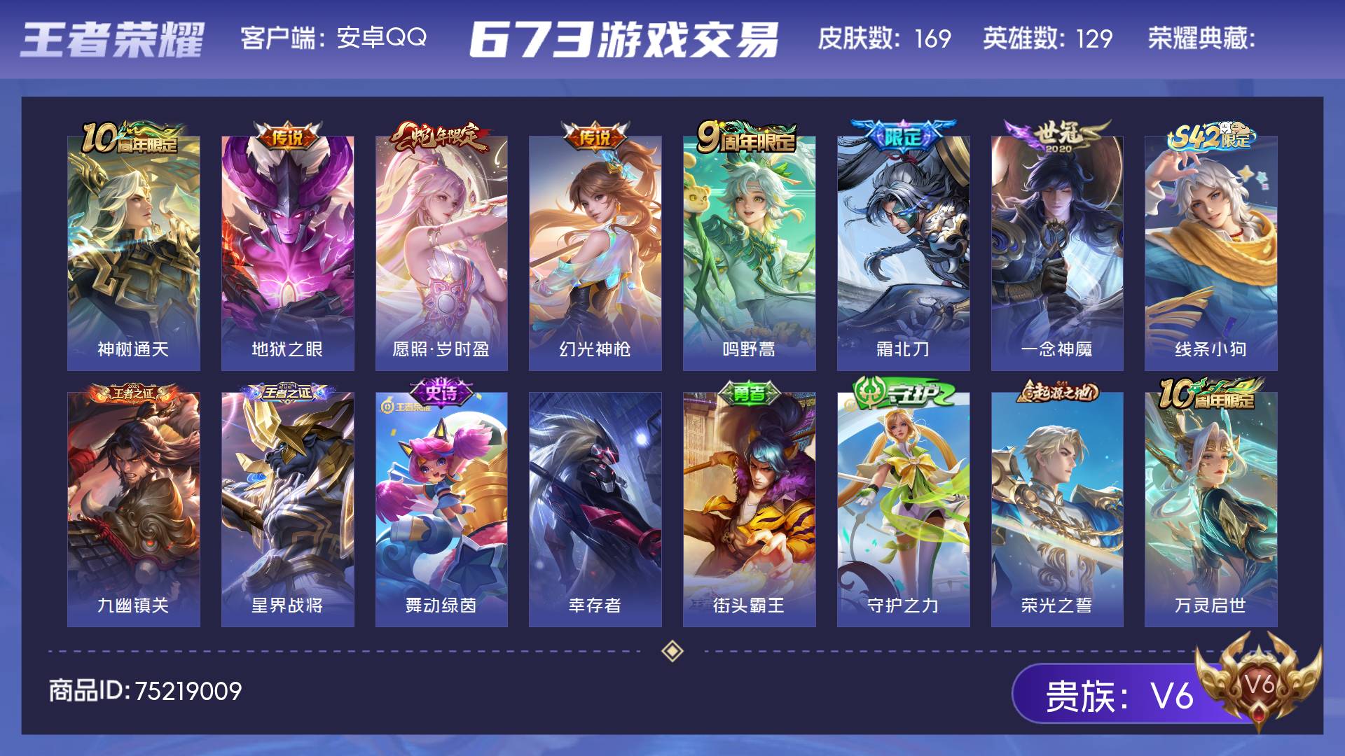 V6 皮肤169 英雄129 永恒钻石 传说7 其他皮肤168