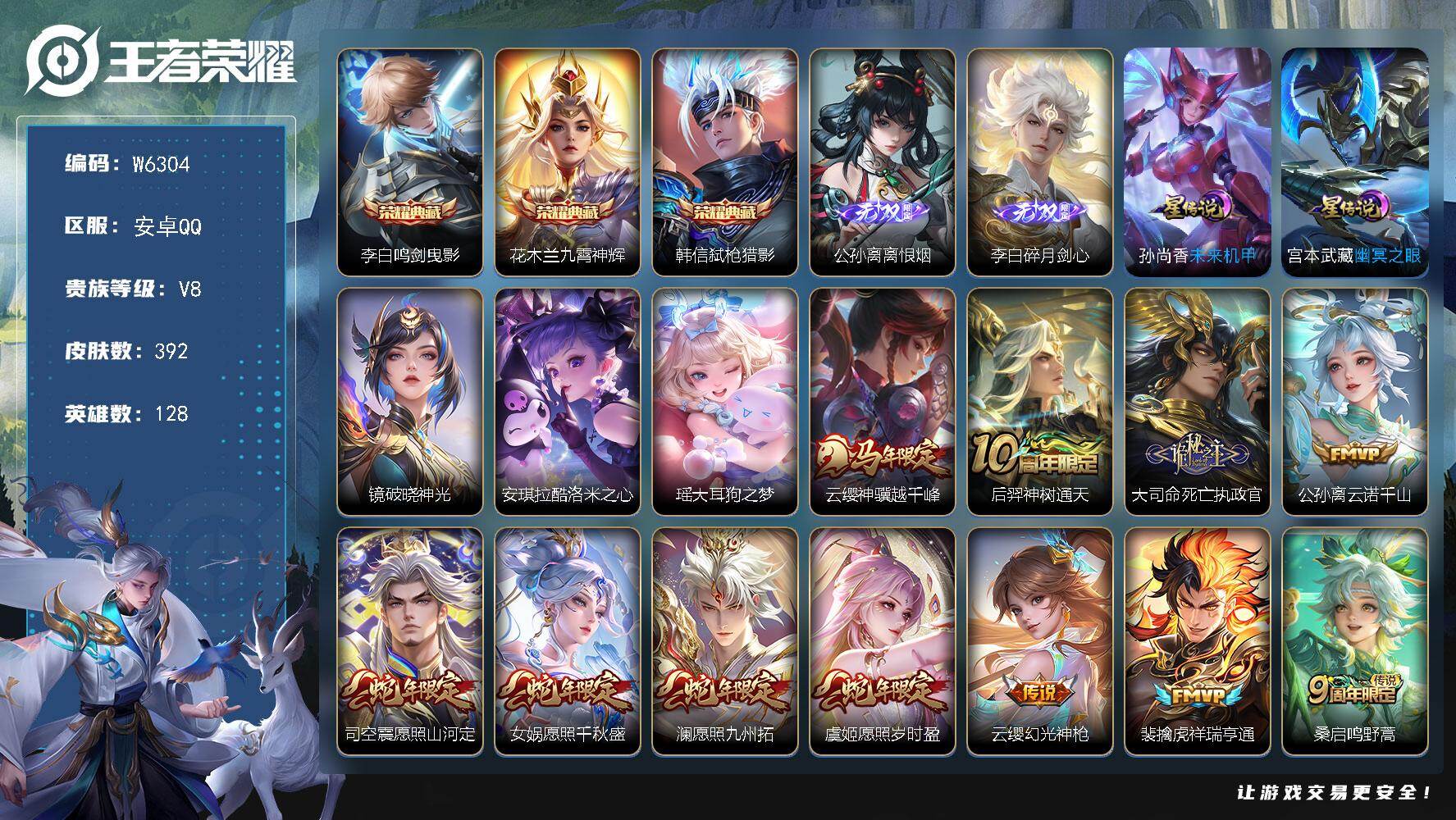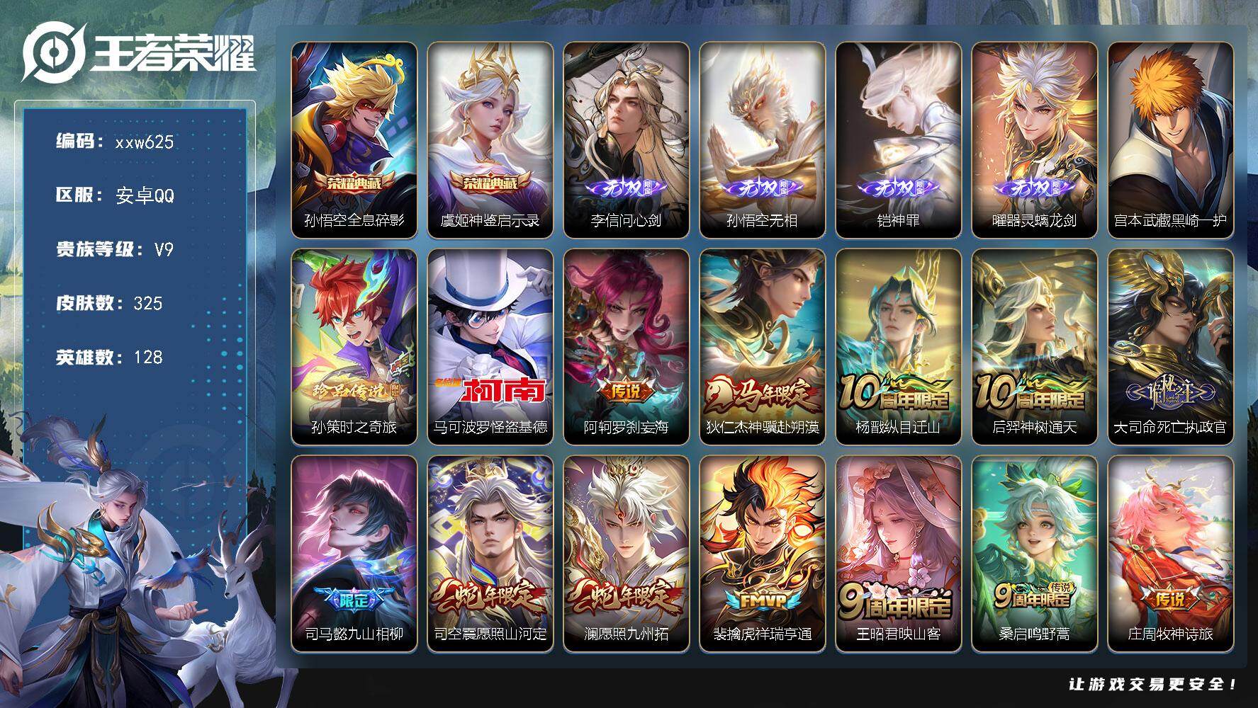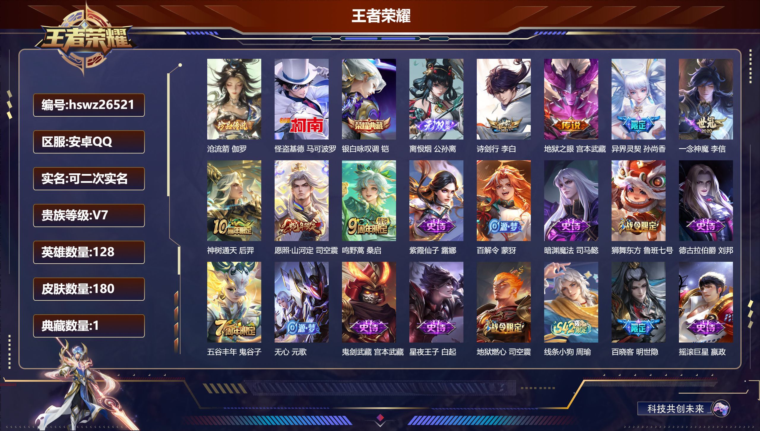安卓QQ/荣耀王者/180皮肤/128英雄/1典藏/0珍品无双/1无双/2珍品传说/7传说/71史诗