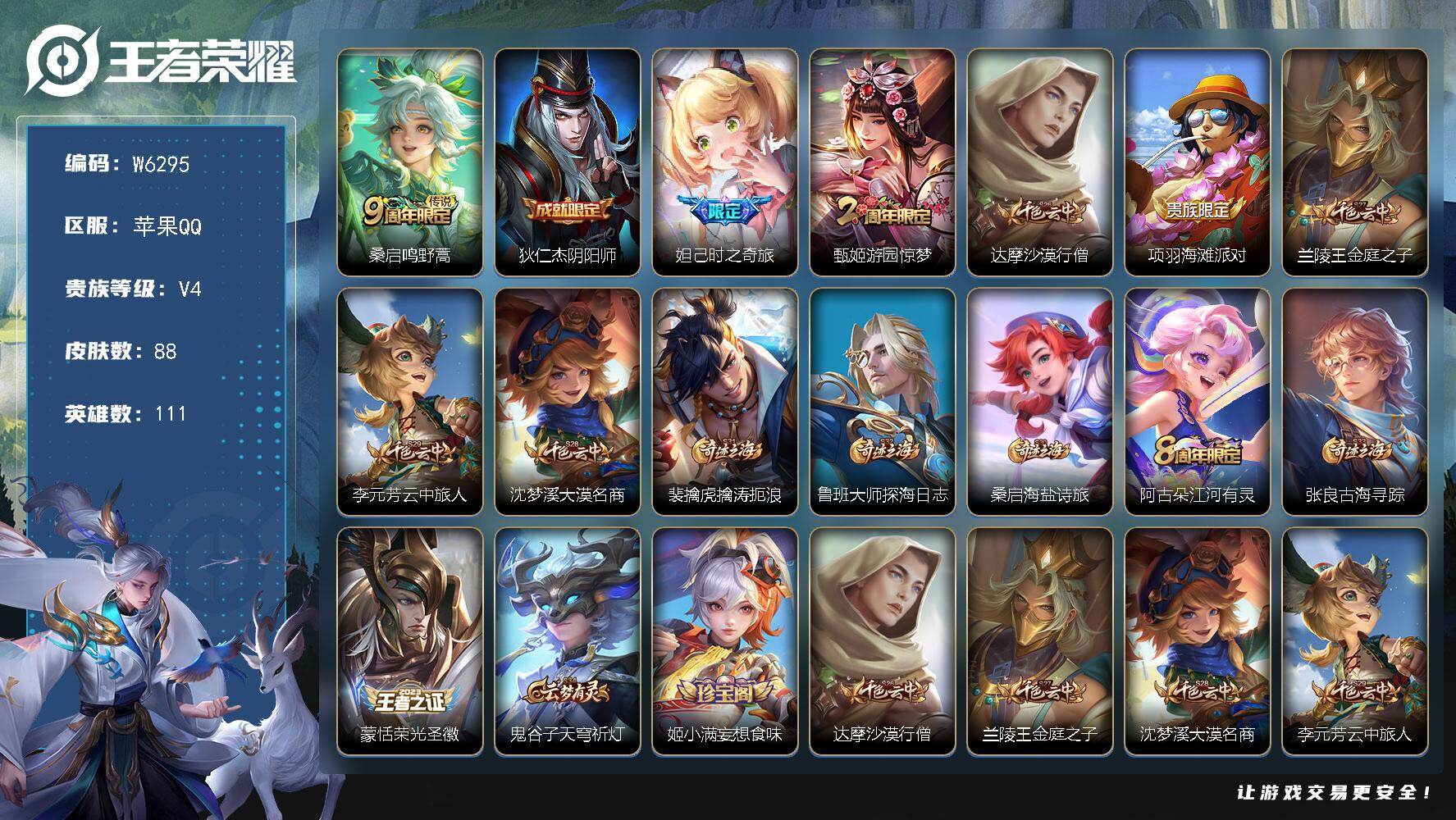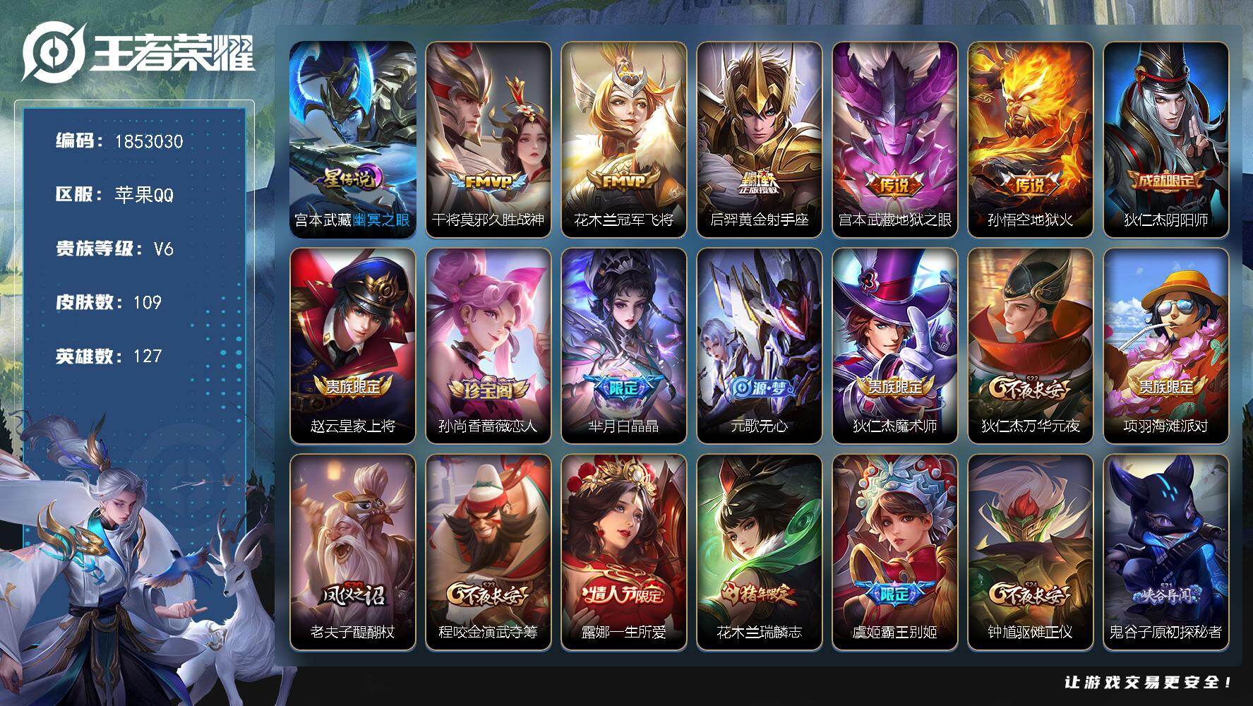 【W6303】苹果QQ-有二次-贵6-126英雄-112皮肤-7传说-1星元-