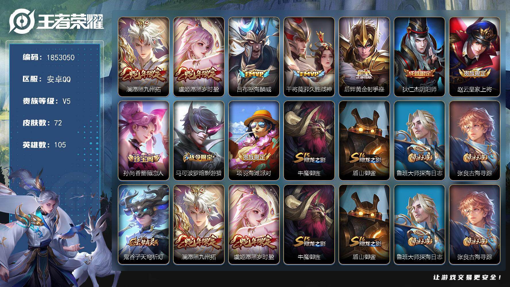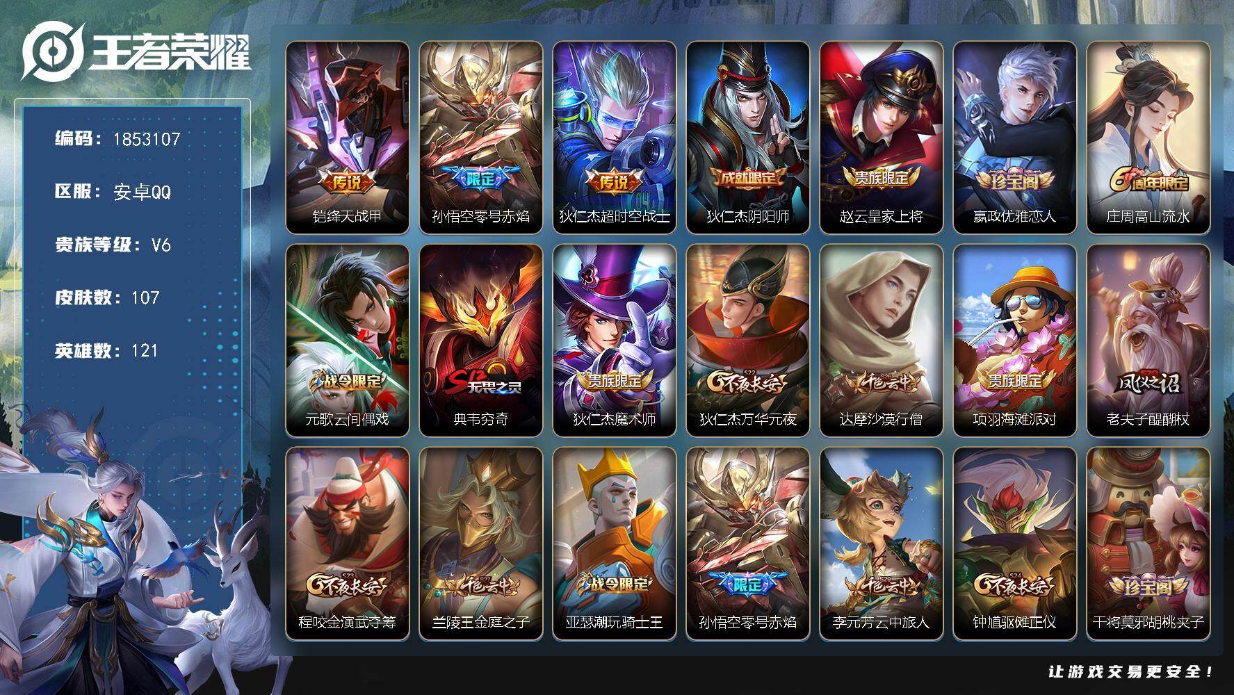 安卓Q-V6-至尊星耀V段位-51英雄-31皮肤-6传说-12史诗【英雄全皮