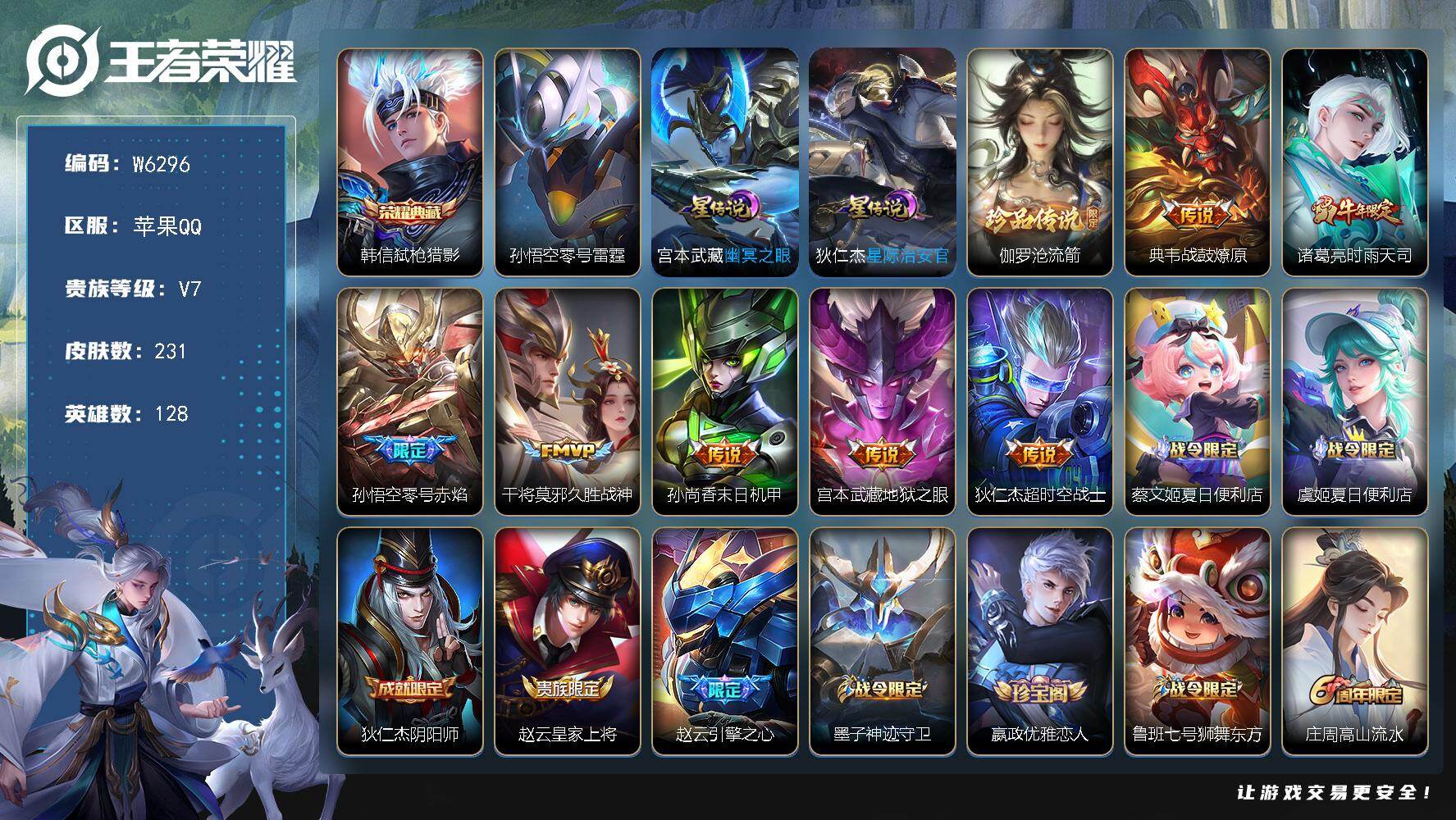 【W6296】苹果Q-不可二次-贵7-128英雄-231皮肤-1典藏-3星元-