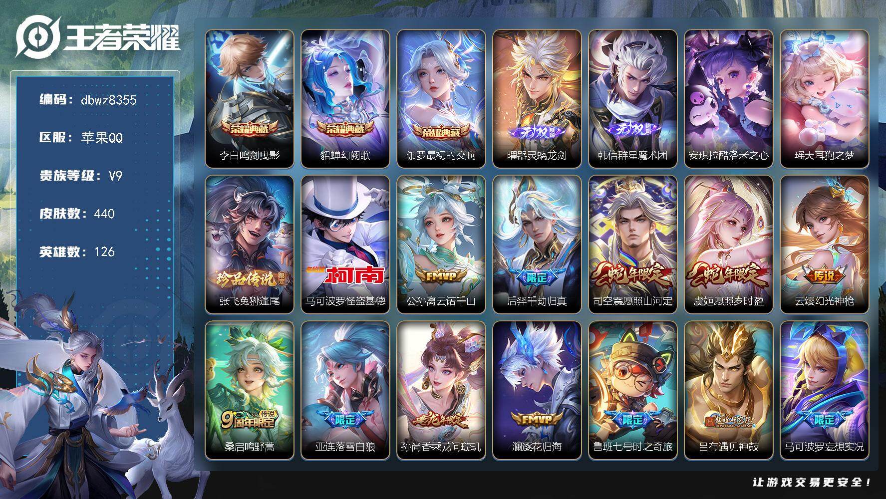 V9-尊贵铂金II段位-126英雄-440皮肤-3典藏皮肤-2无双-