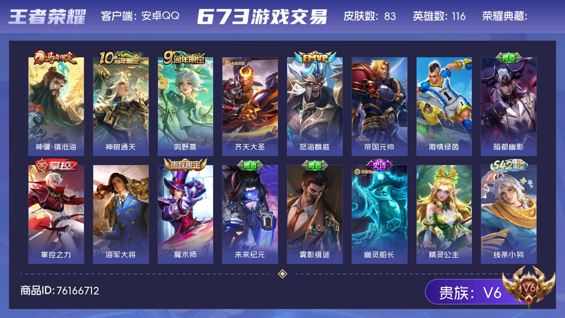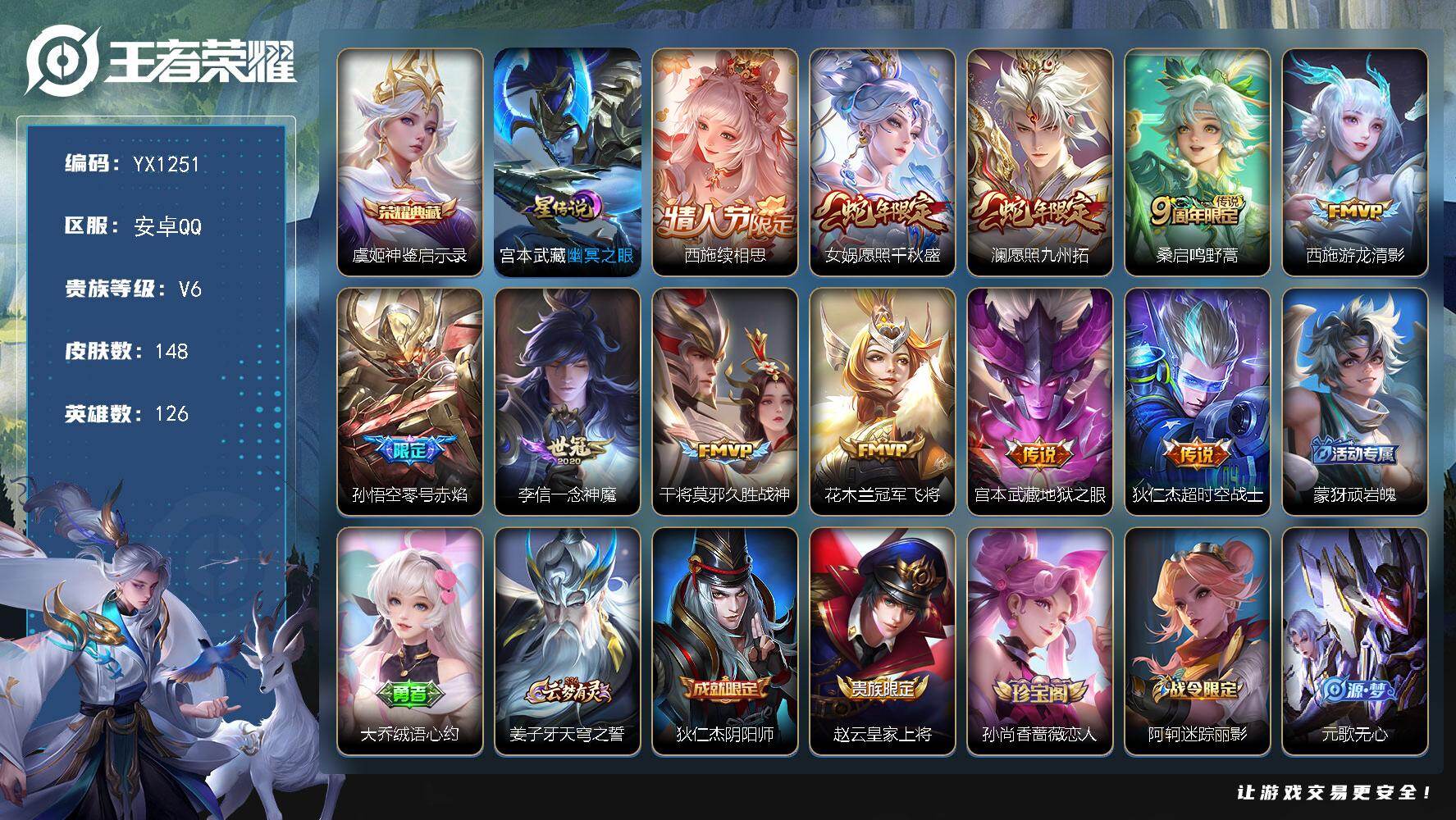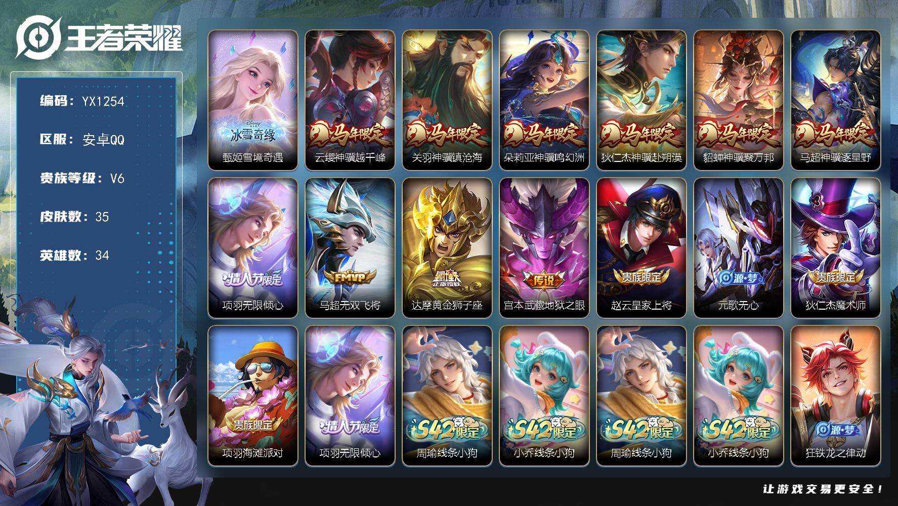 安卓QQ-2典藏-6传说-267皮肤-127英雄-绝世王者-鸣剑曳影 武则天 凤求凰 白虎志 云鹰飞将 大圣娶亲 一生所爱 青春决赛季 引擎之心 老号便宜甩