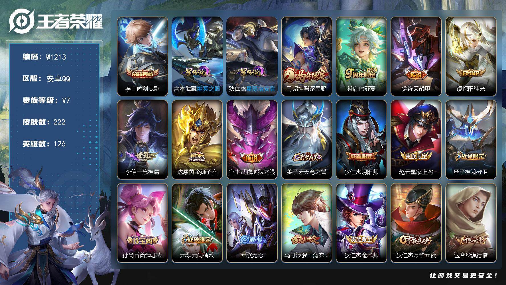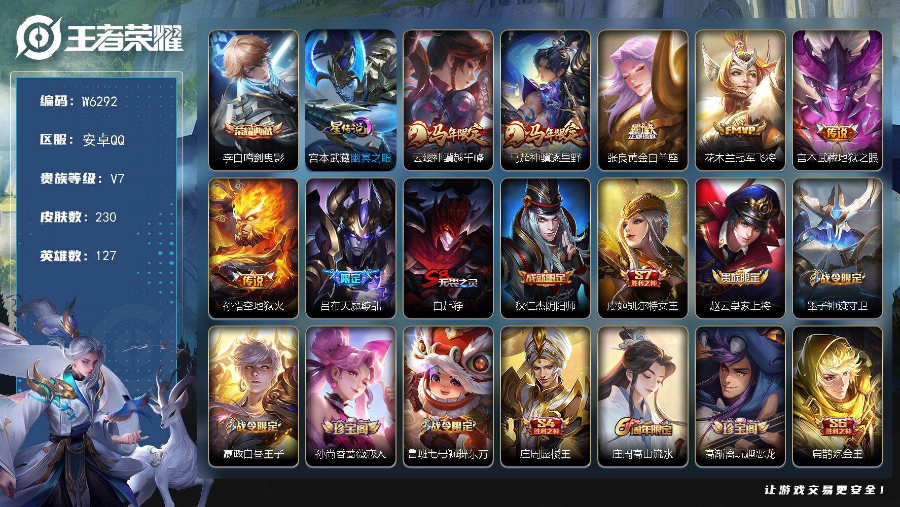 【W6292】安卓Q区-可二次-贵7-127英雄-230皮肤-1典藏-7传说-