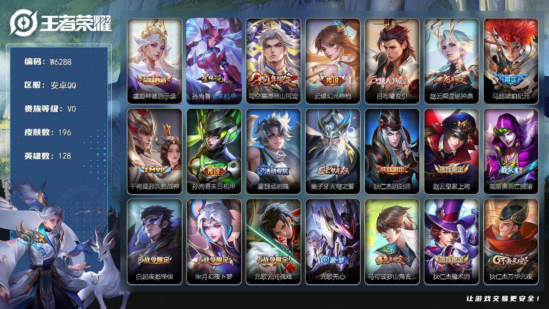 【W6288】安卓Q区-可二次-贵7-128英雄-196皮肤-1典藏-7传说-