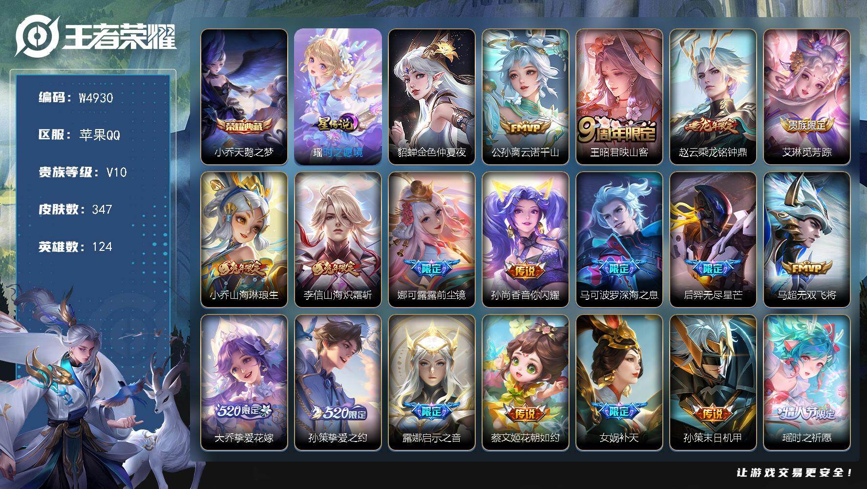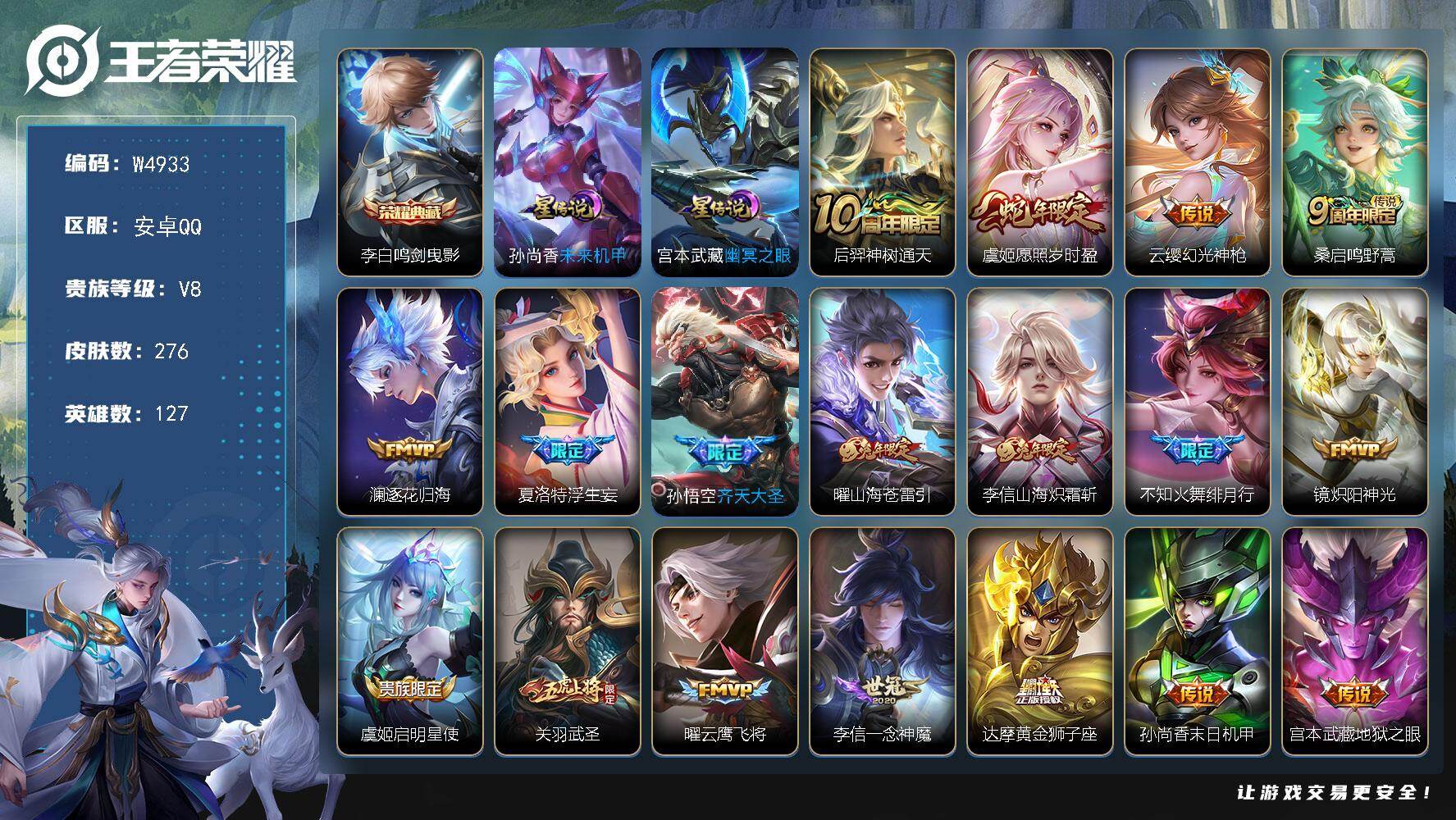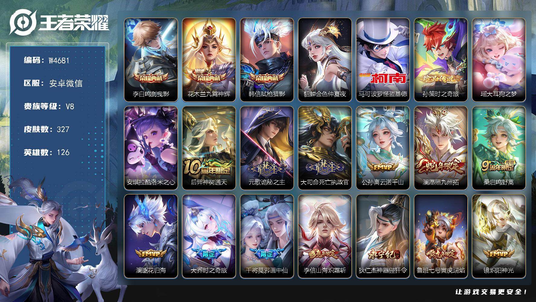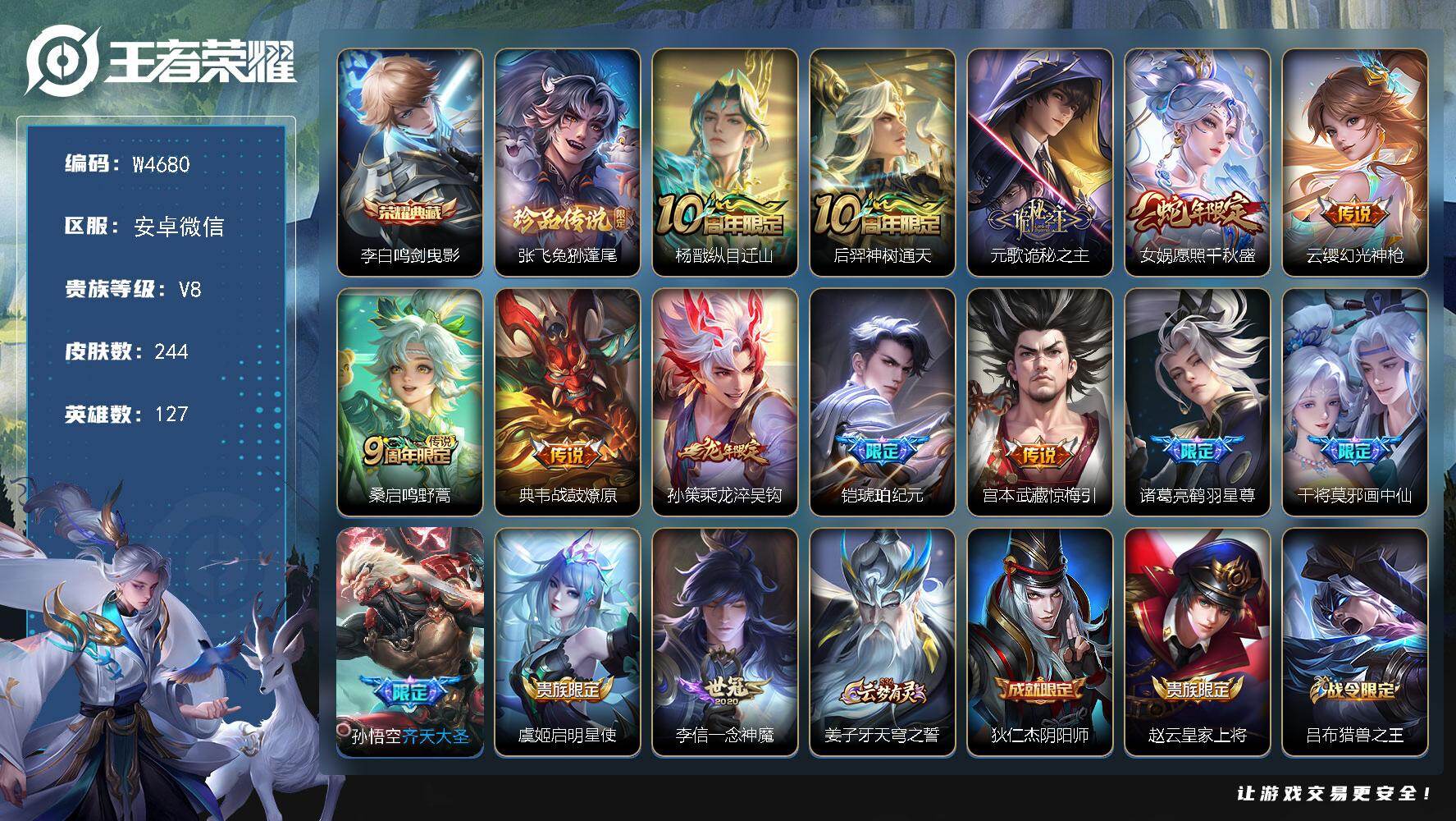 【W4680】安卓微信-可二次-贵8-127英雄-244皮肤-1典藏-1珍品传