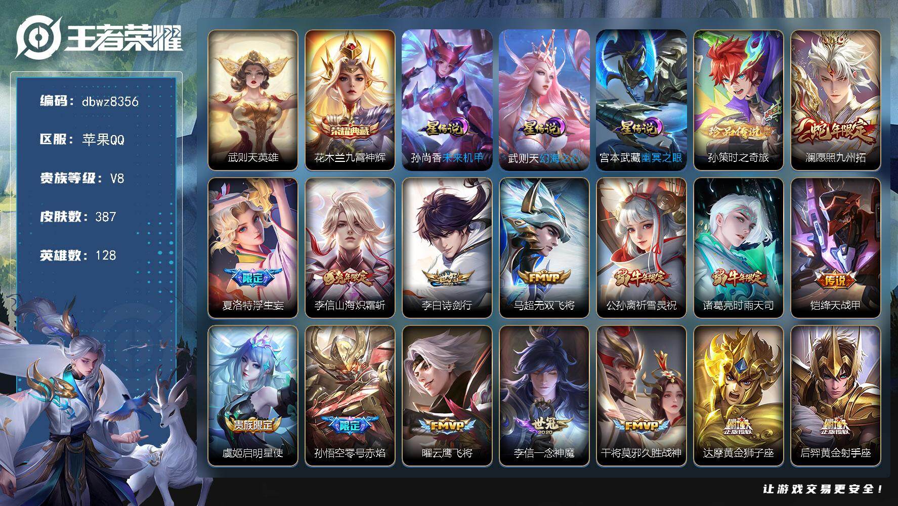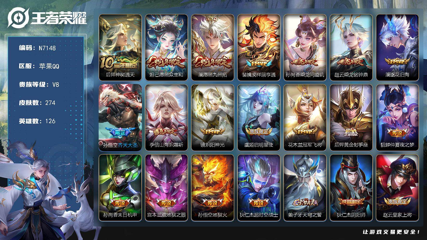 苹果Q-V8-永恒钻石III段位-126英雄-274皮肤-18传说-77史诗【