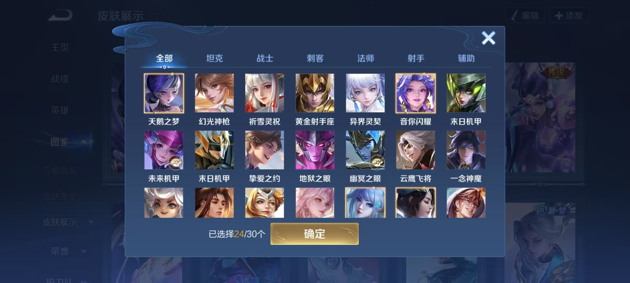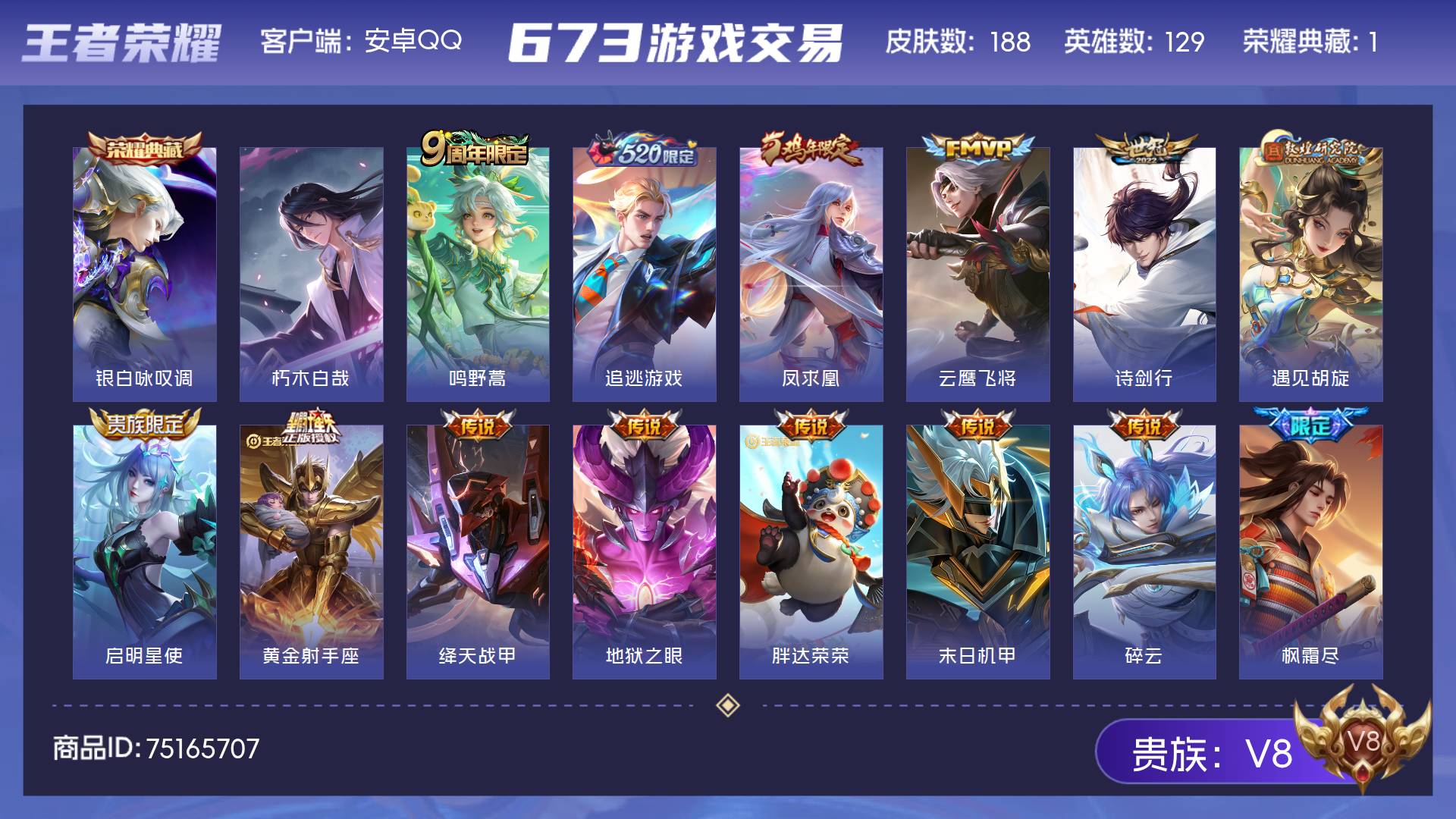 V8 皮肤188 英雄129 至尊星耀 荣耀典藏1 珍品传说1 传说18 其他皮肤174