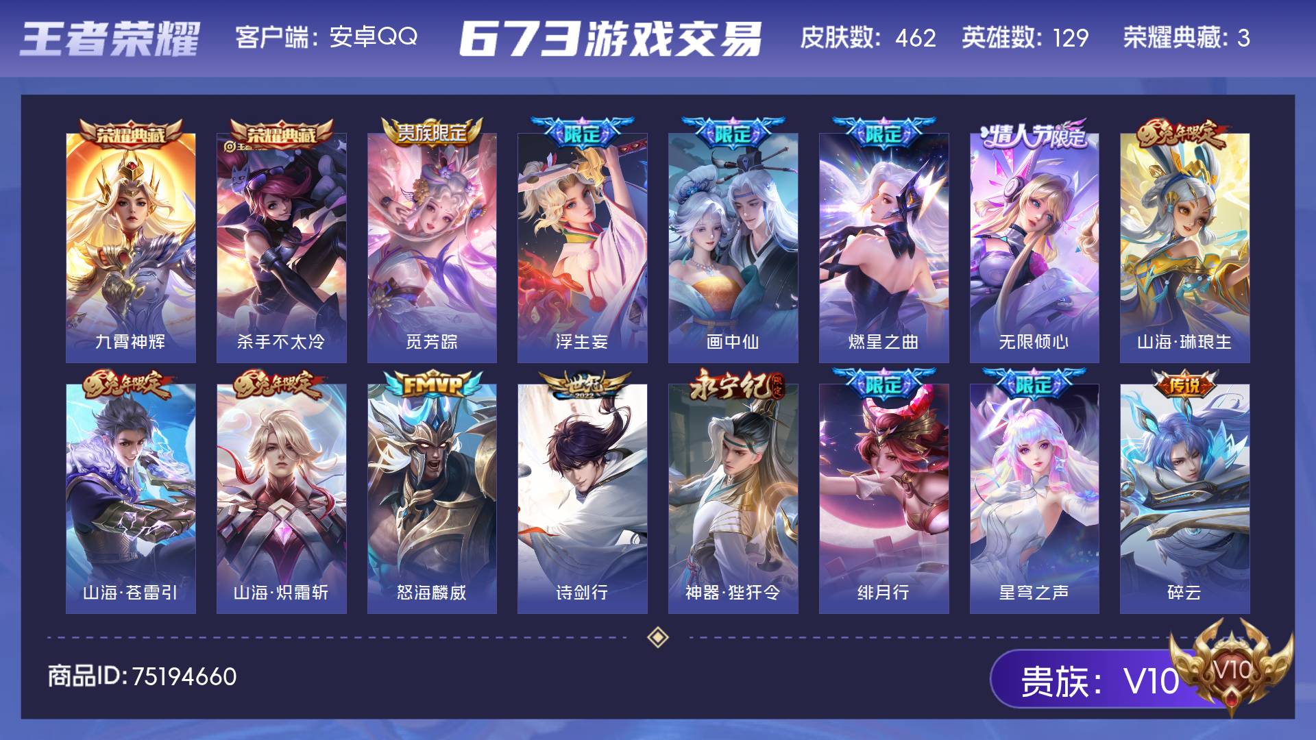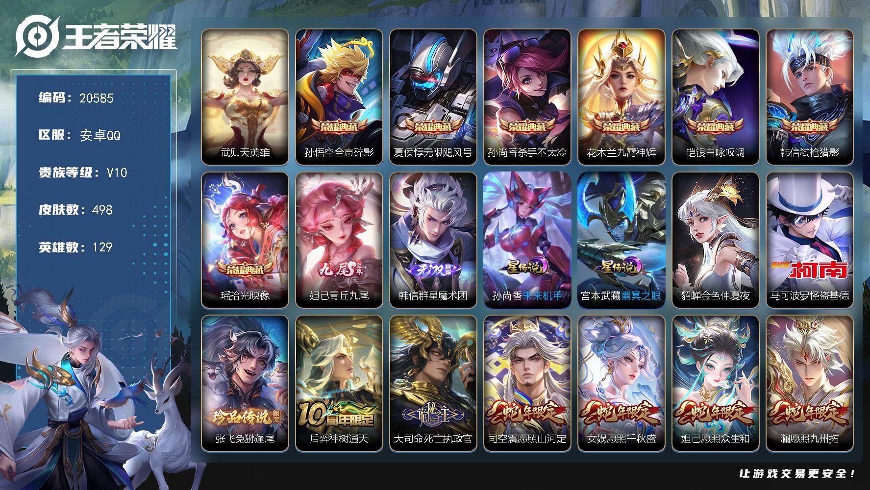 V10 皮肤462 英雄129 至尊星耀 荣耀典藏3 传说60 其他皮肤405