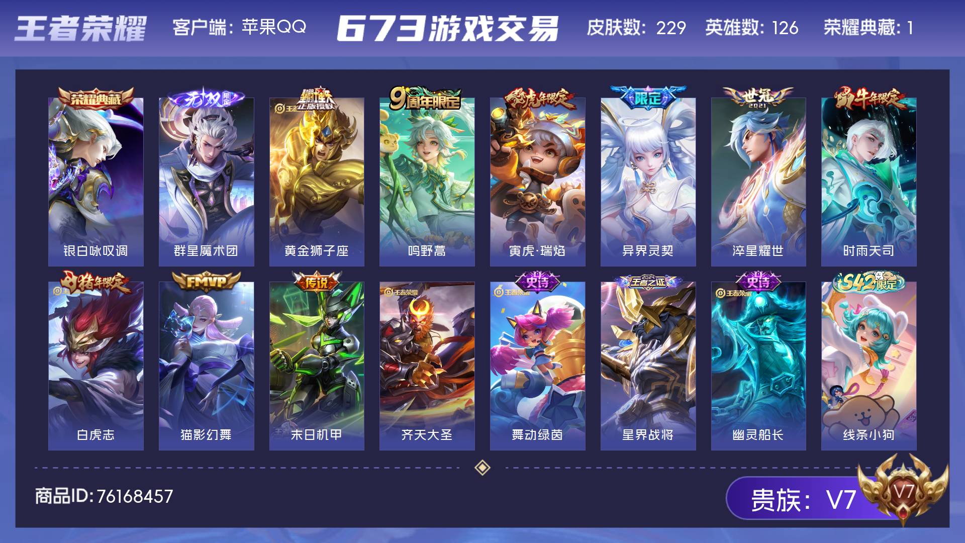 V7 皮肤229 英雄126 无双王者 荣耀典藏1 无双皮肤1 星传说2 传说11