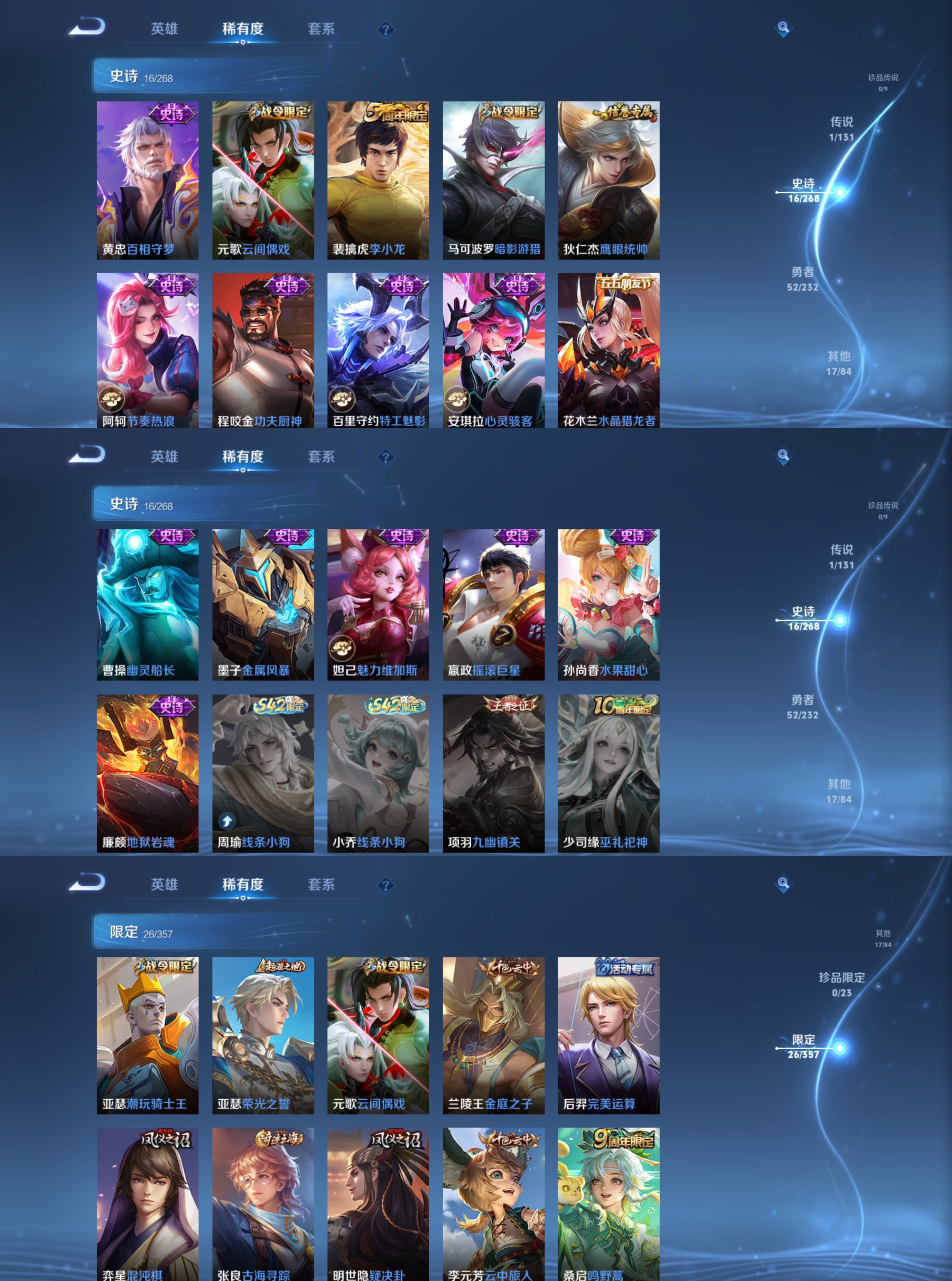 皮肤206 英雄125 至尊星耀 荣耀典藏1 传说3 其他皮肤94-王者1典藏3传说一些史诗,火影1