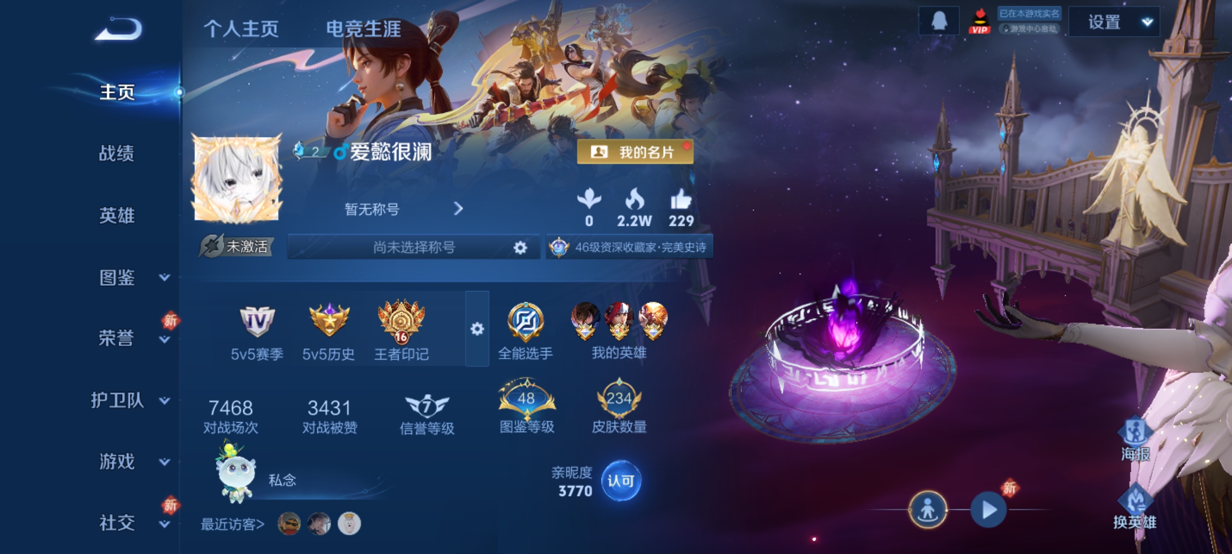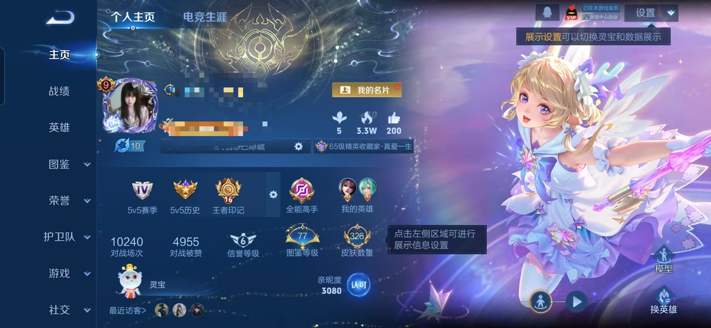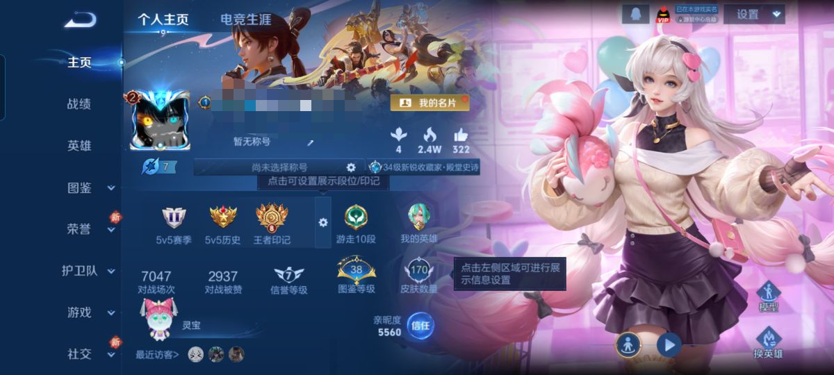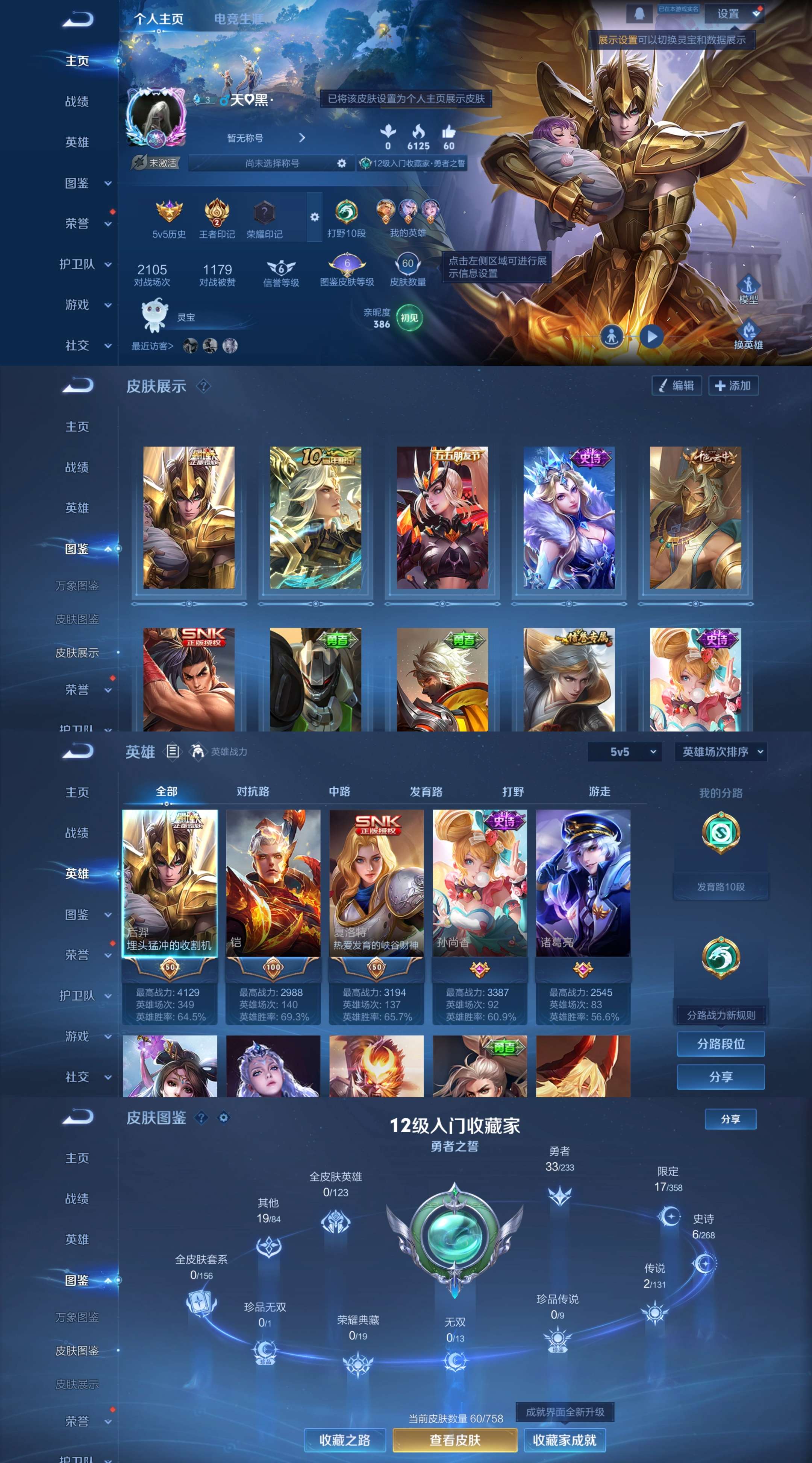 贵族等级: V6 英雄数: 60 皮肤数: 34 无双皮: 雪境奇遇-甄姬,无