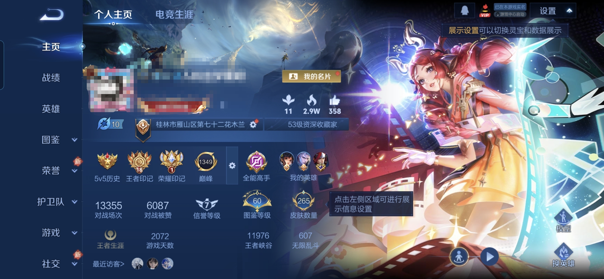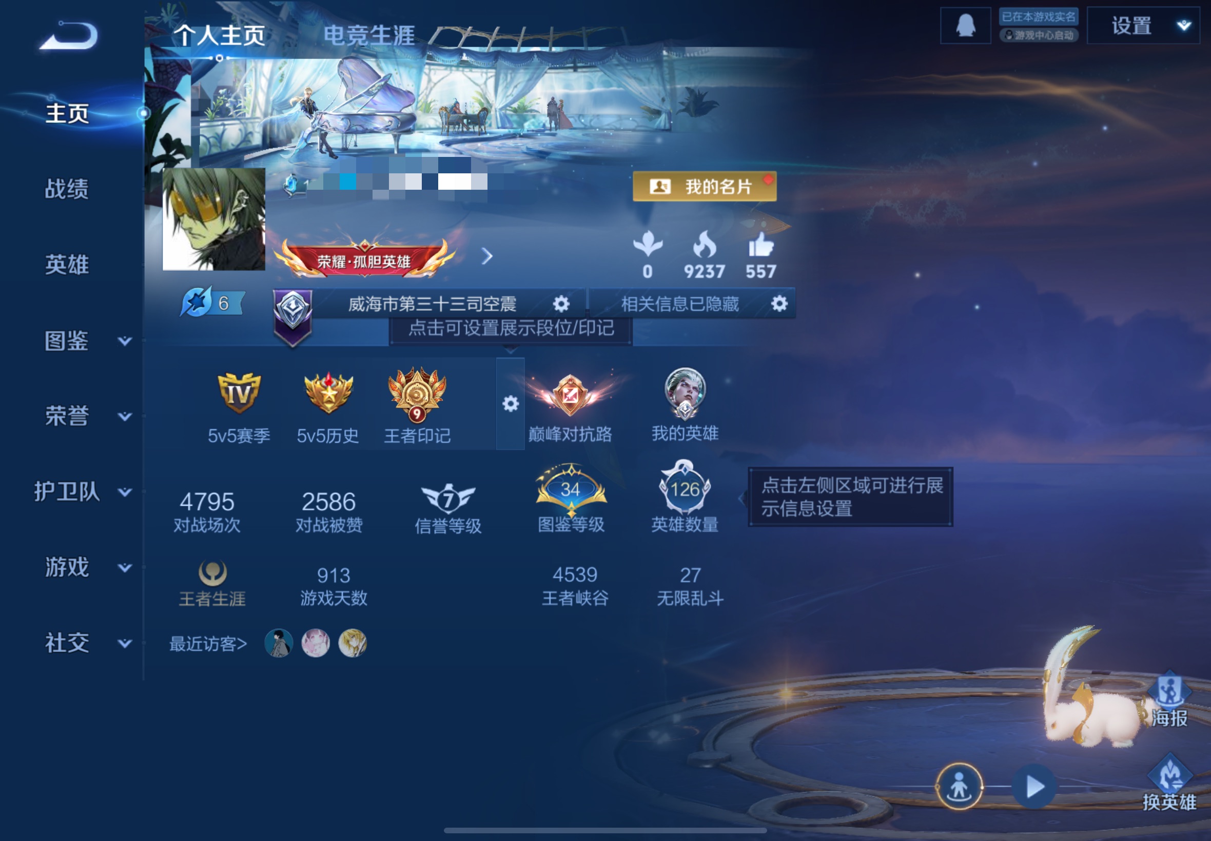 贵族等级: V7 英雄数: 126 皮肤数: 264 荣耀水晶: 鸣剑·曳影