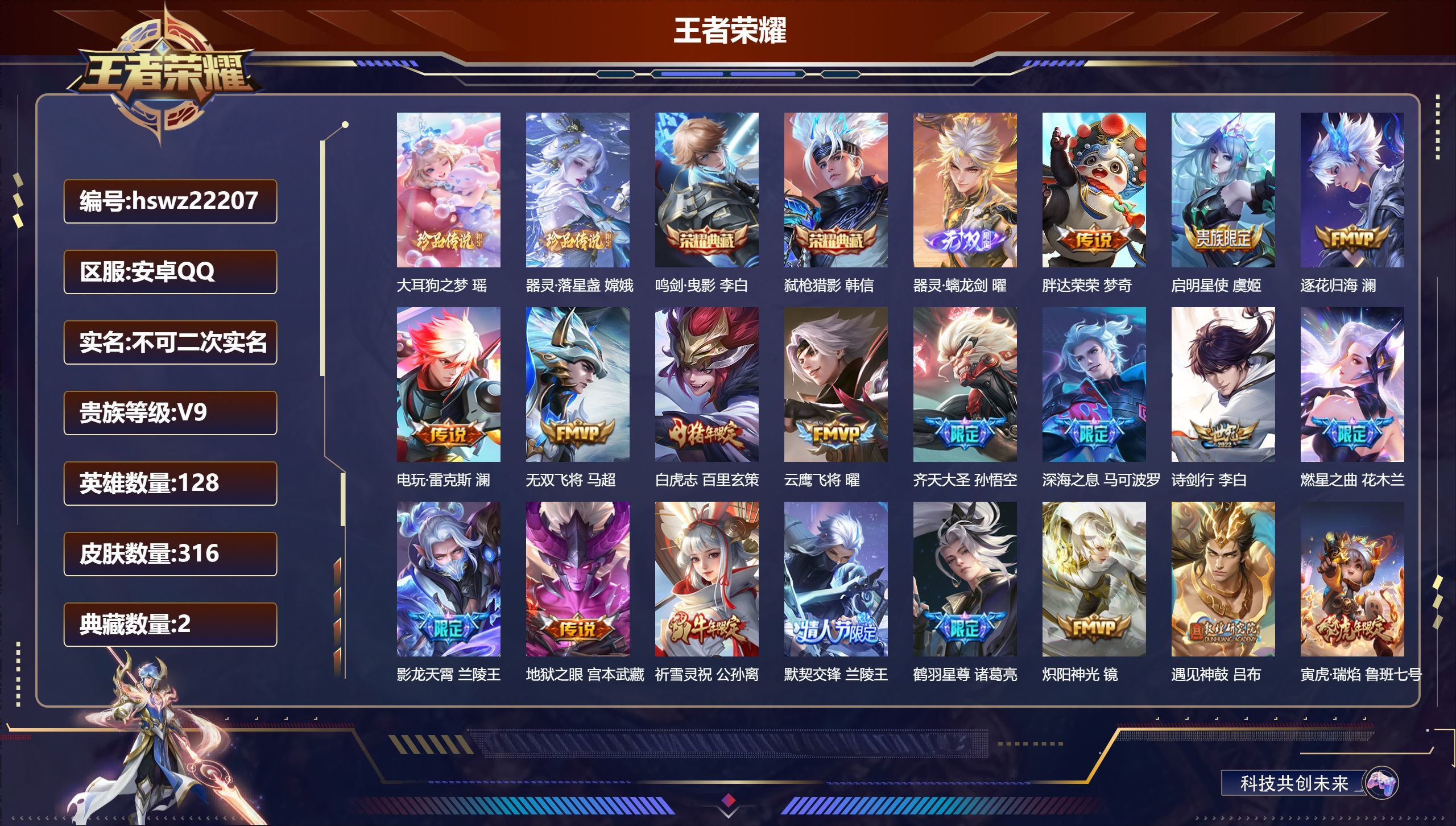 安卓QQ/永恒钻石/316皮肤/128英雄/2典藏/0珍品无双/1无双/2珍品传说/43传说/97史