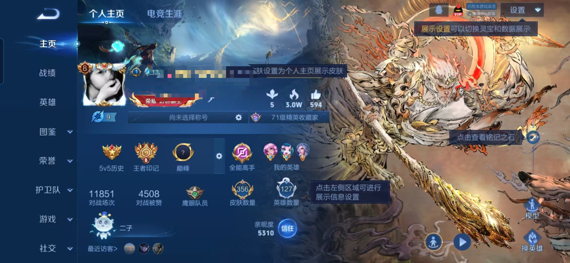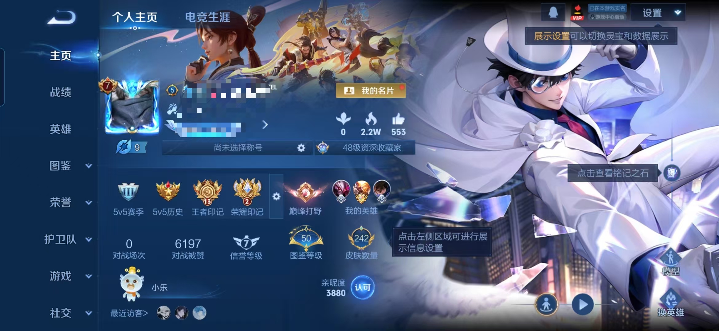 实名: 可修改 贵族等级: V8 英雄数: 128 皮肤数: 276 荣耀水晶