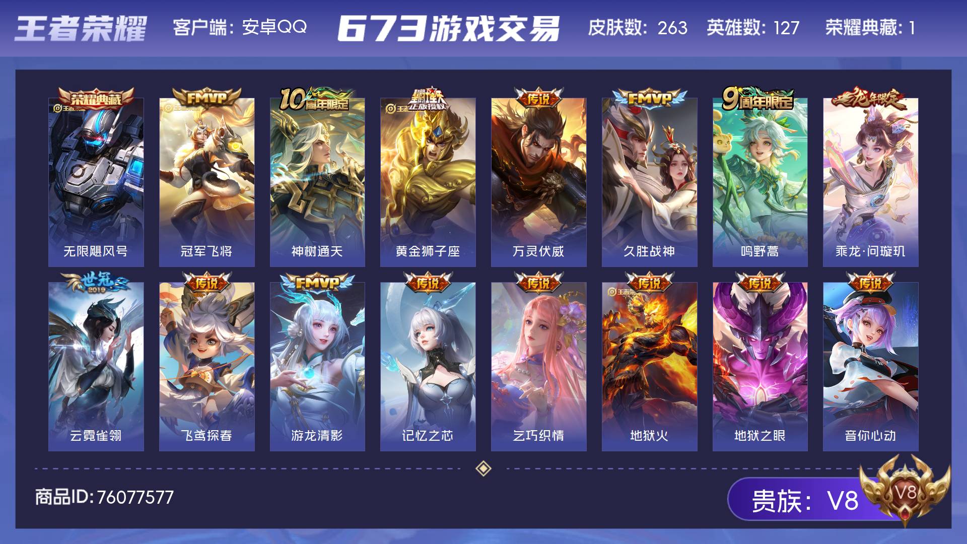 V8 皮肤263 英雄127 至尊星耀 荣耀典藏1 星传说2 传说30 其他皮肤238