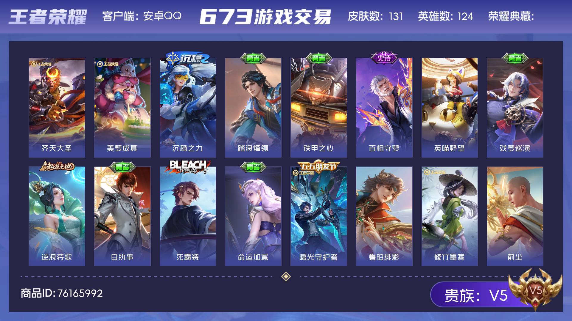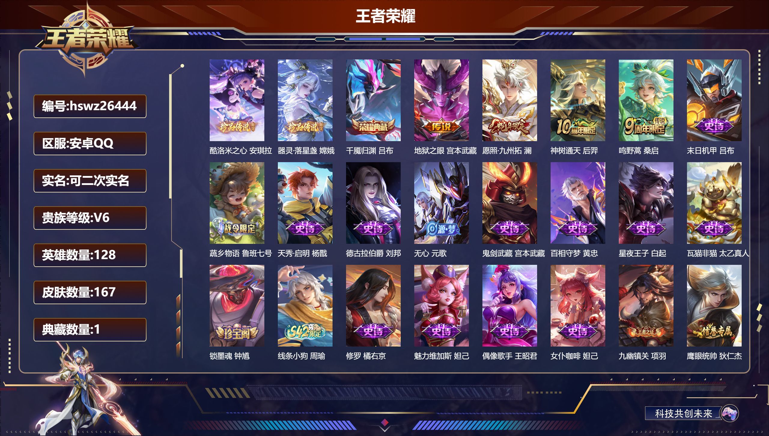 安卓QQ/荣耀王者/167皮肤/128英雄/1典藏/0珍品无双/0无双/2珍品传说/4传说/47史诗