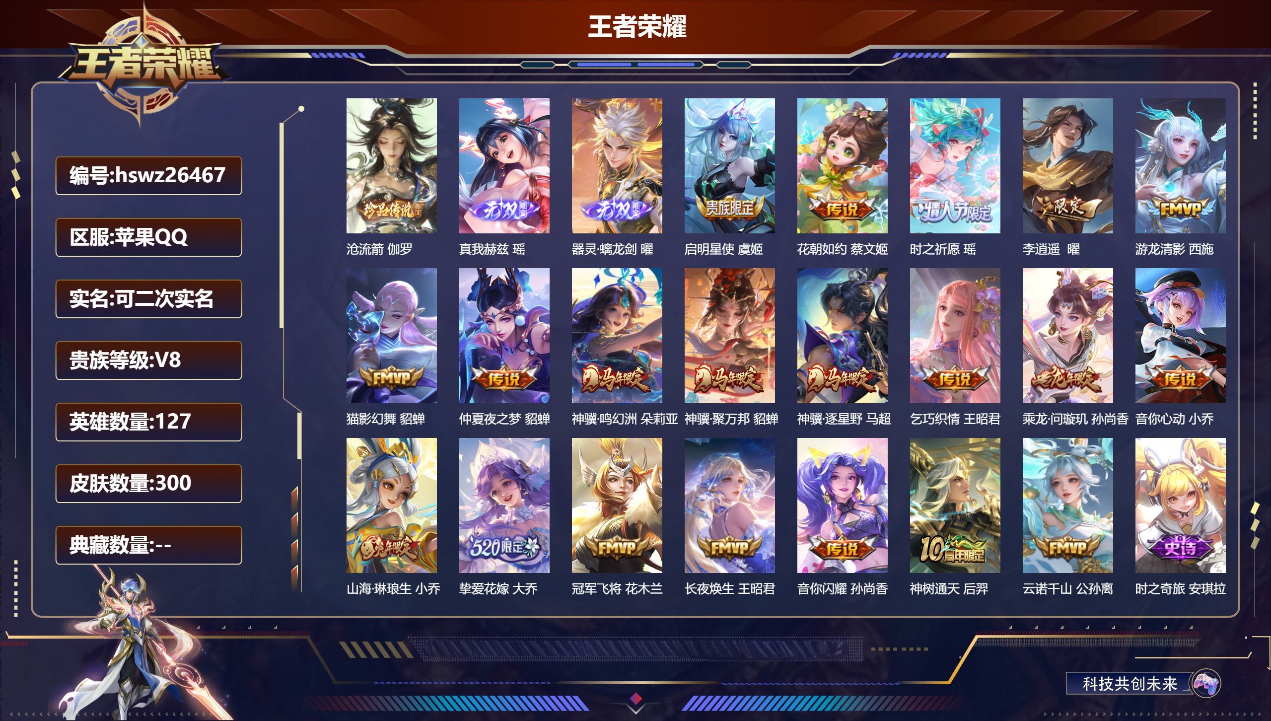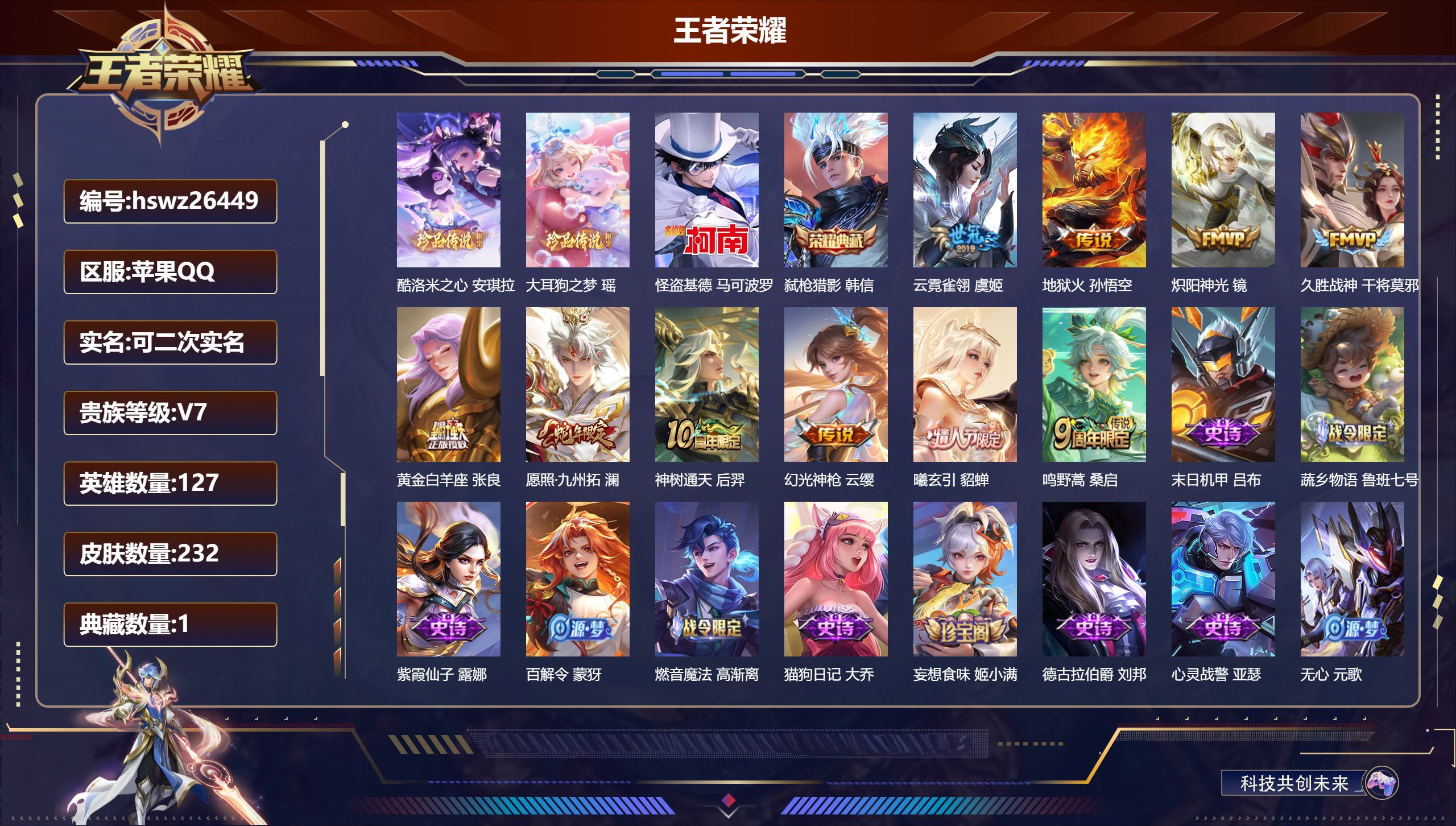 苹果QQ/至尊星耀/232皮肤/127英雄/1典藏/0珍品无双/0无双/3珍品传说/10传说/69史