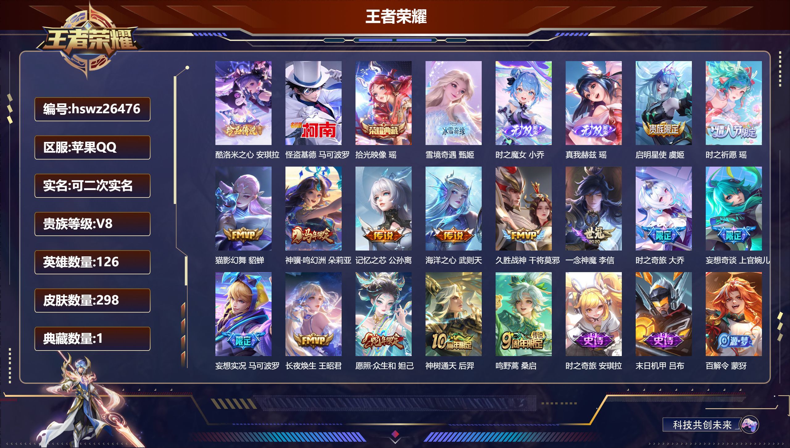 苹果QQ/最强王者/298皮肤/126英雄/1典藏/0珍品无双/3无双/2珍品传说/15传说/94史