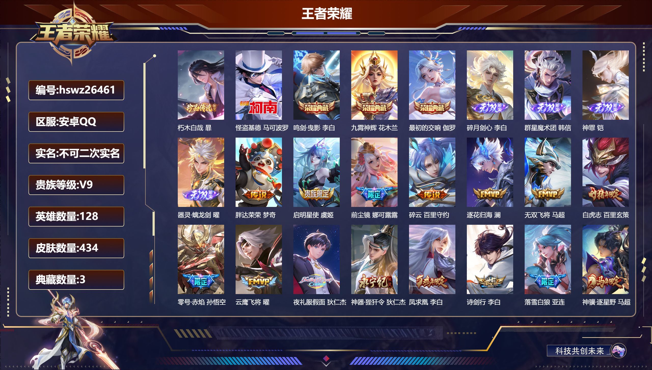 安卓QQ/至圣王者/434皮肤/128英雄/3典藏/0珍品无双/4无双/2珍品传说/50传说/135