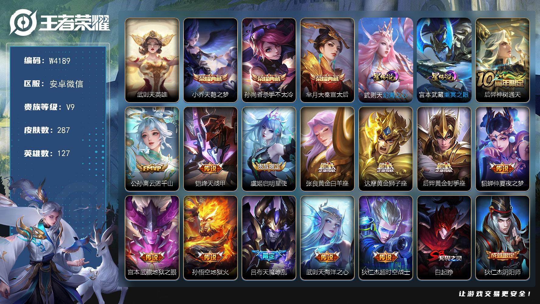 皮肤305 英雄127 荣耀王者 荣耀典藏7 珍品传说1 传说11 其他皮肤109-王者荣耀v9极品号,荣耀水晶八个,还有一个没有兑换,有省标市标一堆,传说史诗多多,具体看图,感兴趣拍