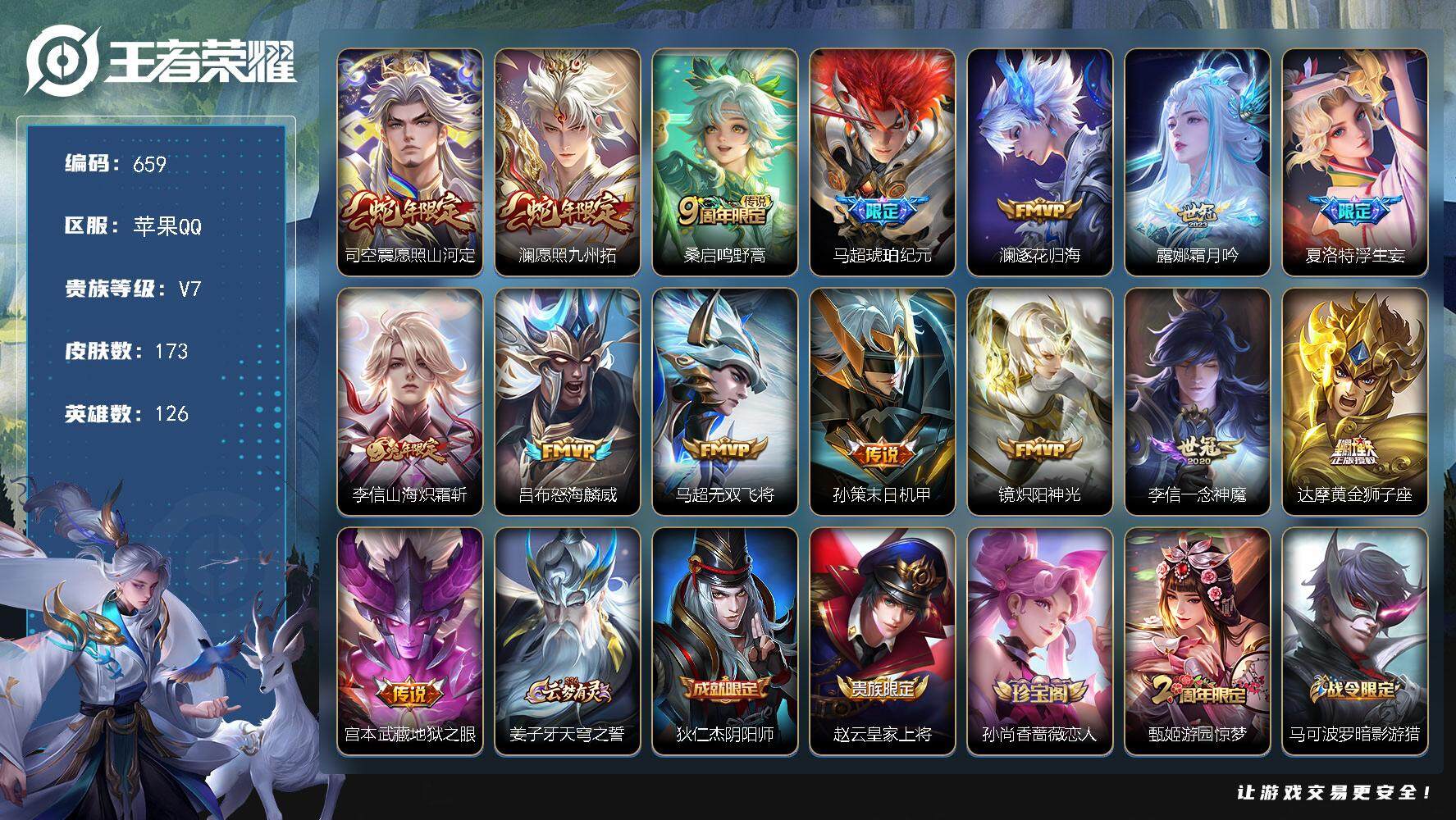 1850821 王者荣耀账号 苹果Q-V7-最强王者段位-126英雄-173皮