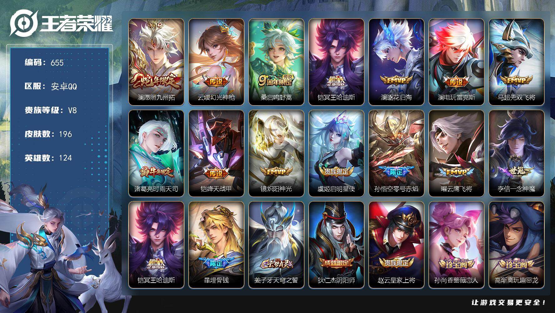 1850804 王者荣耀账号 安卓Q-V8-最强王者段位-124英雄-196皮