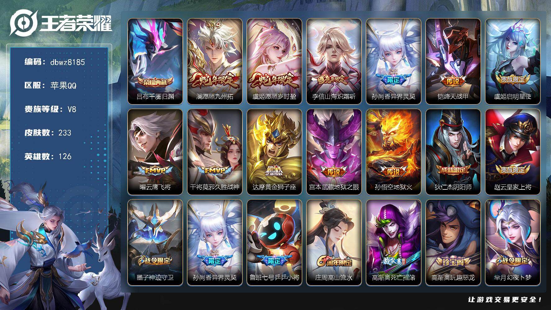苹果Q-V8-最强王者段位-126英雄-233皮肤-1典藏皮肤-11传说-65史