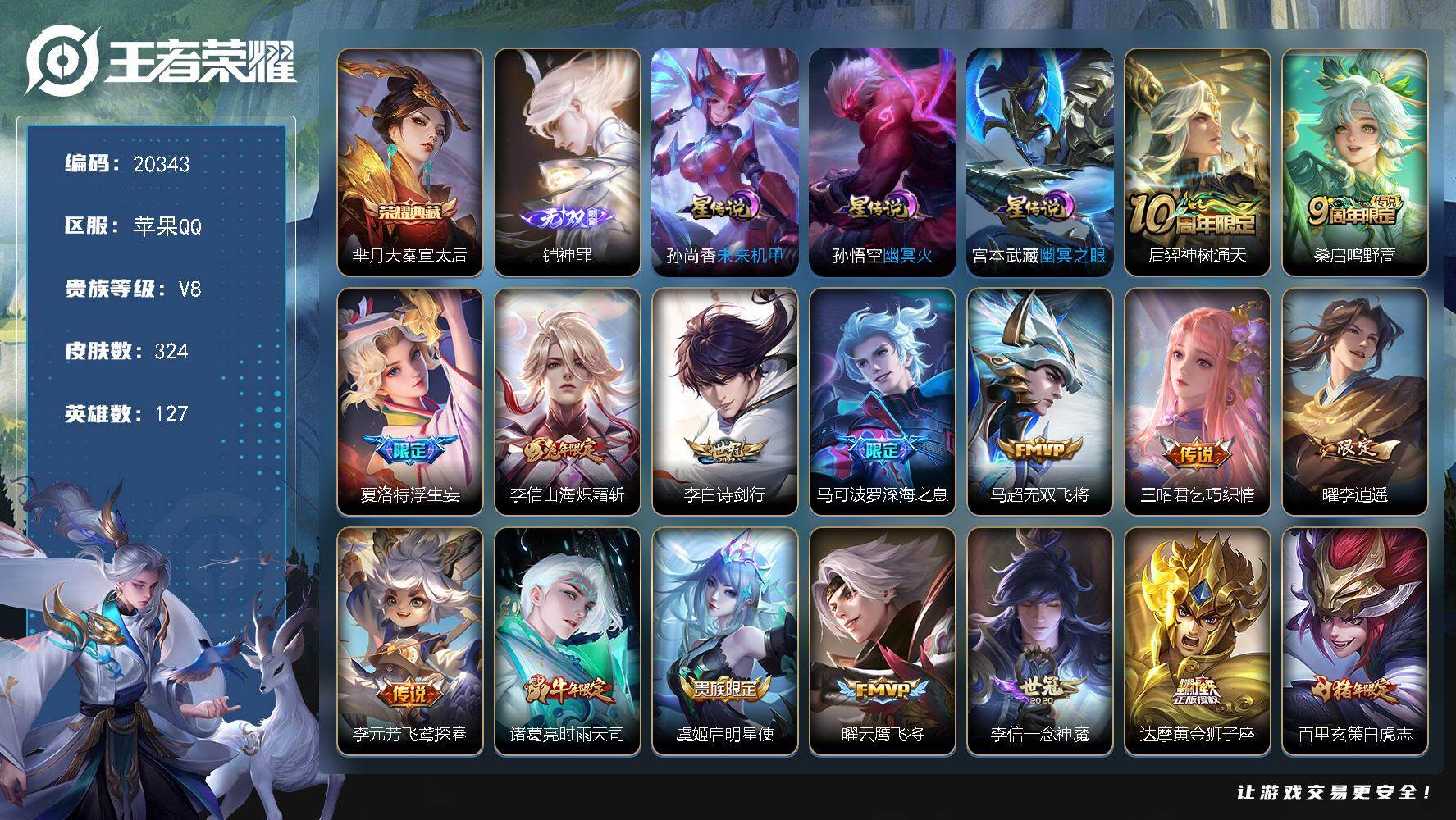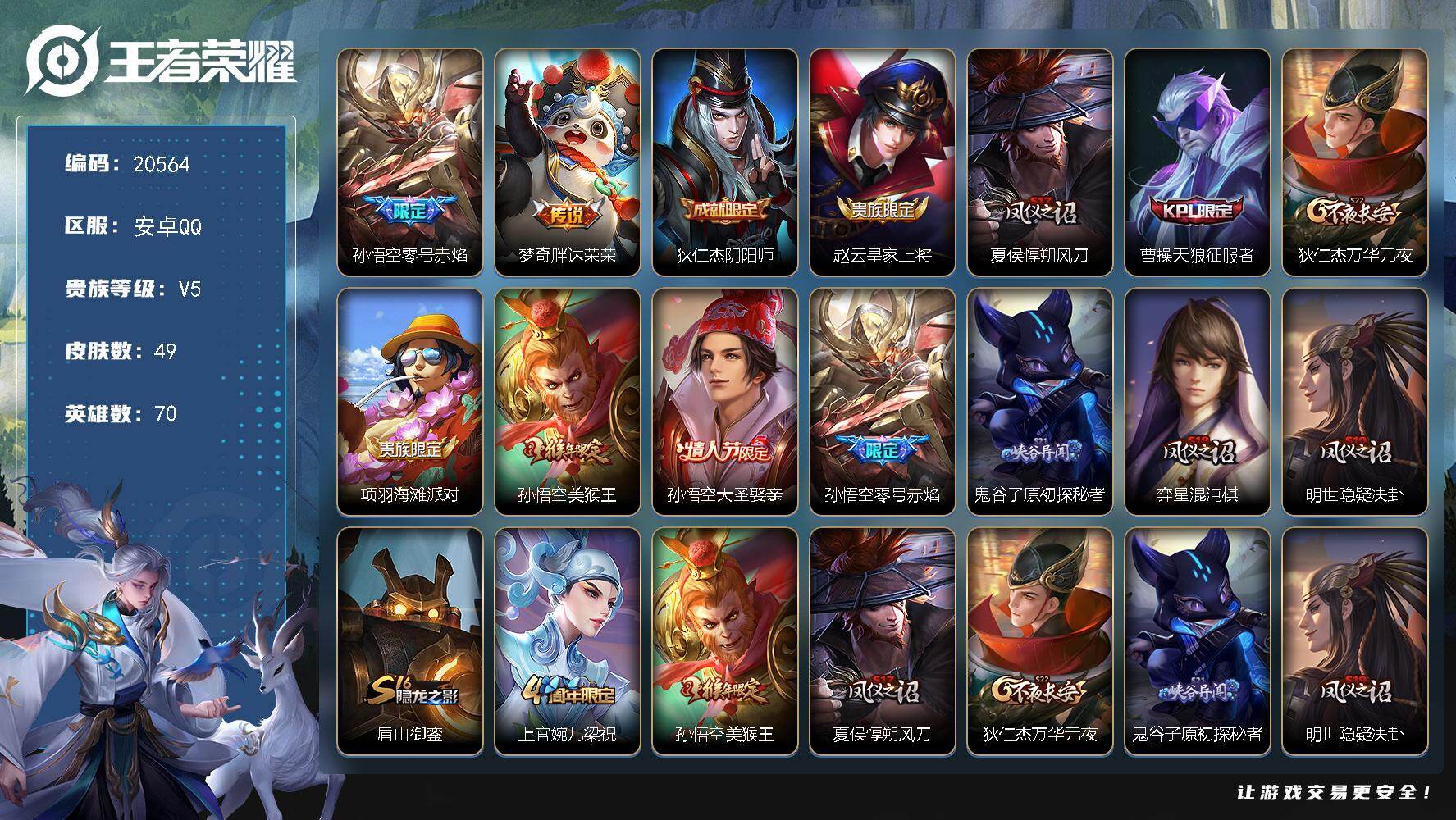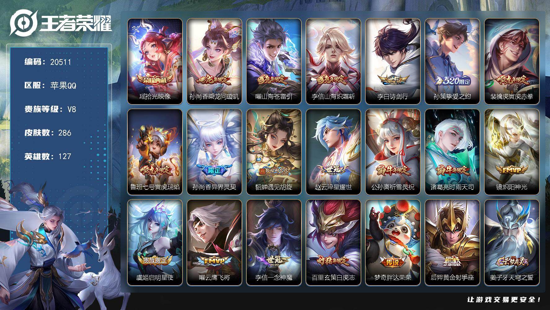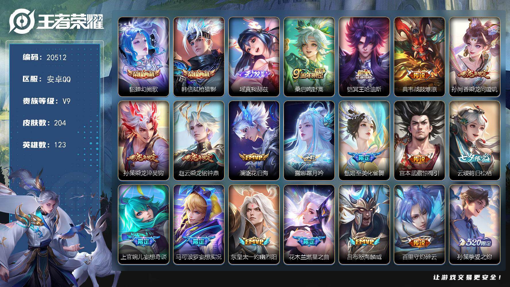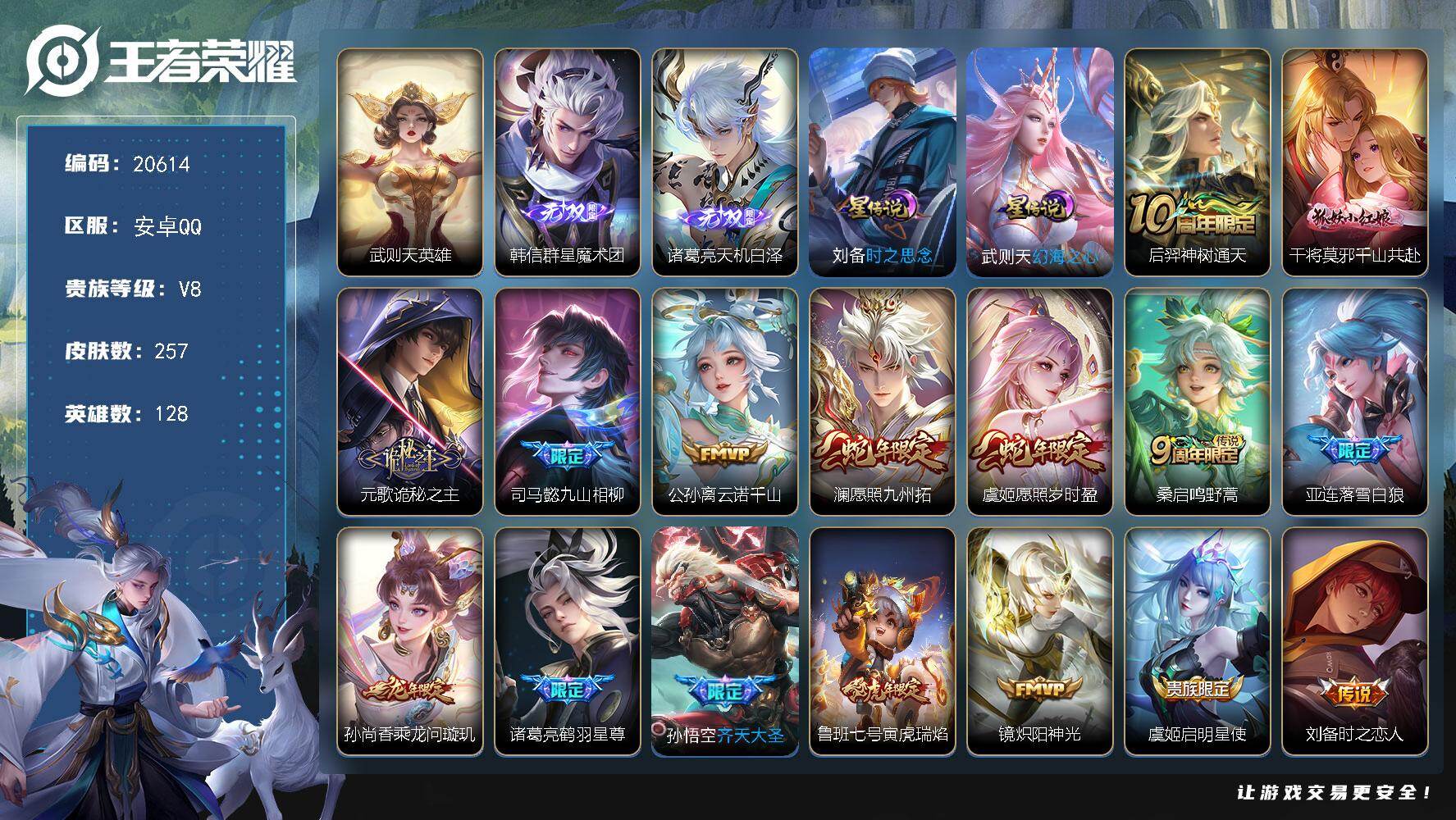 安卓QQ/至尊星耀/177皮肤/125英雄/1典藏/0珍品无双/3无双/0珍品传说/28传说/52史