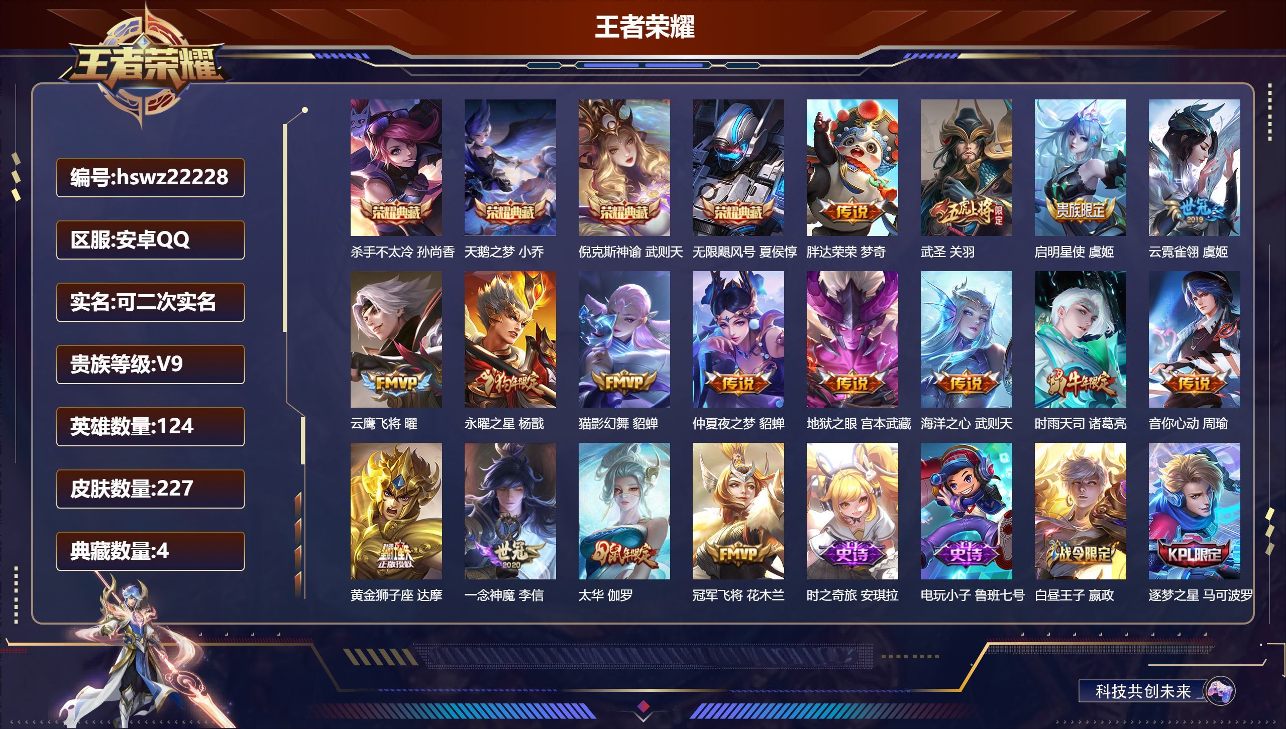 安卓QQ/永恒钻石/227皮肤/124英雄/4典藏/0珍品无双/0无双/0珍品传说/16传说/65史