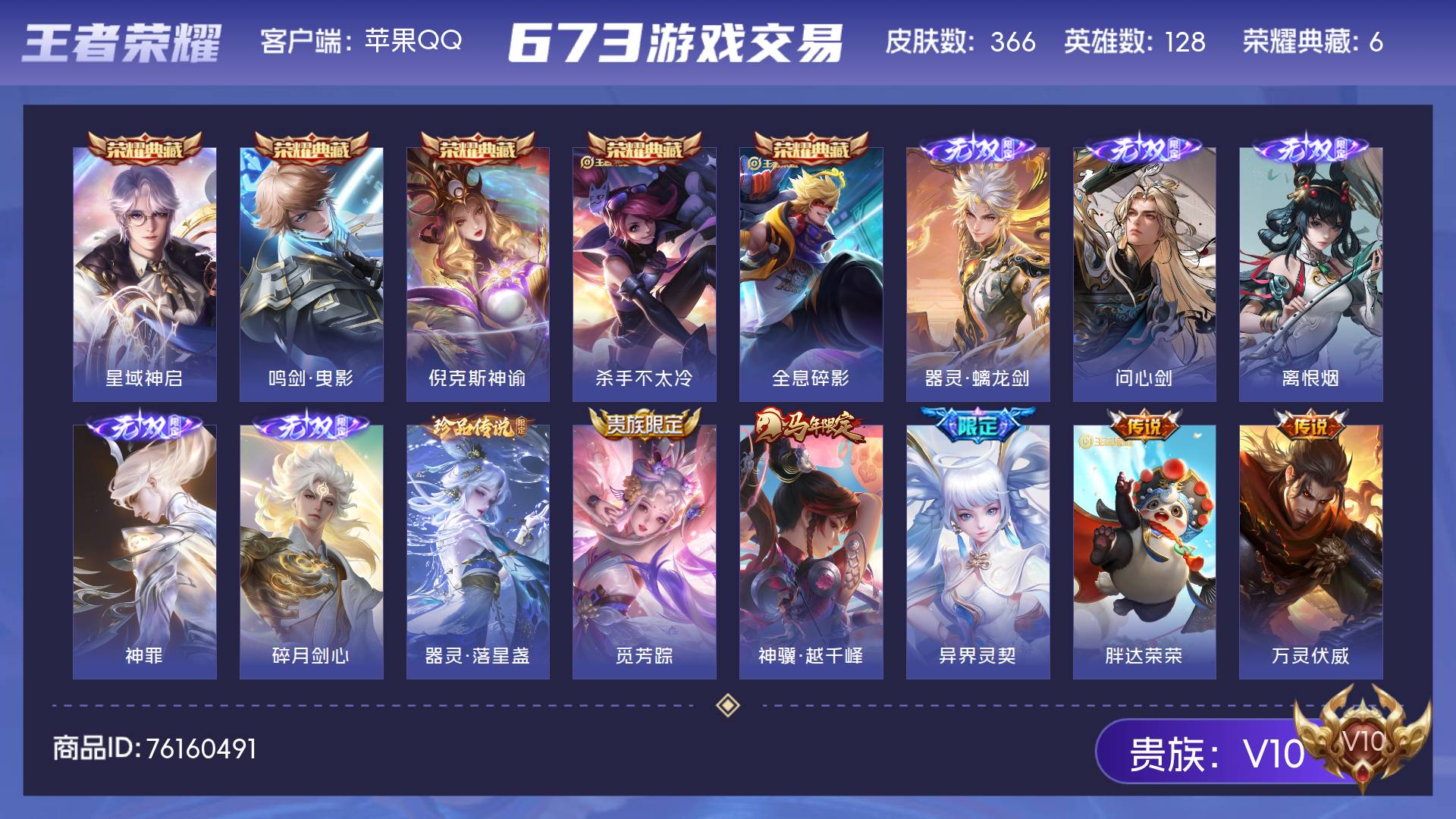 V10 皮肤366 英雄128 荣耀王者 荣耀典藏6 无双皮肤5 珍品传说1 星传说6 传说26