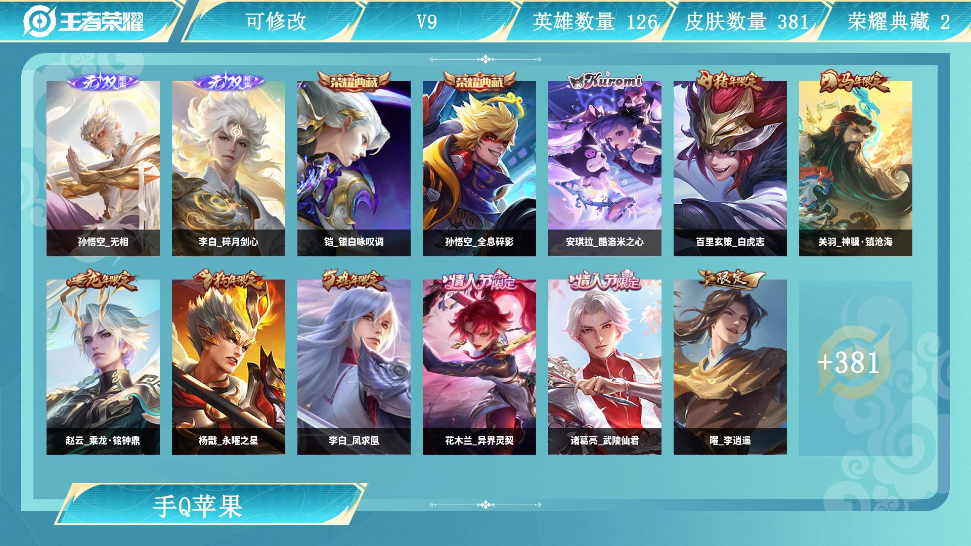 无相!白虎志!皮肤数量381印记总数25V9非凡王者可修改账