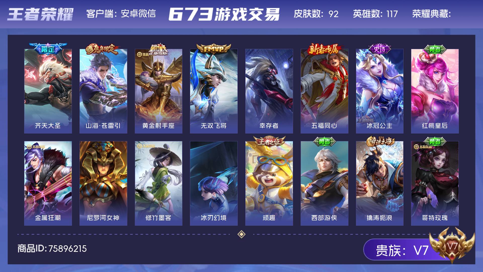 V7 皮肤92 英雄117 尊贵铂金 传说4 其他皮肤94
