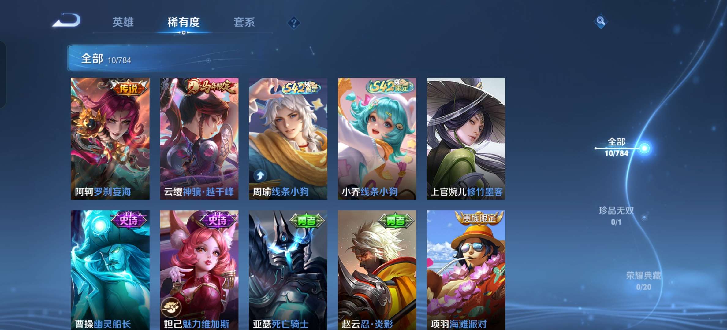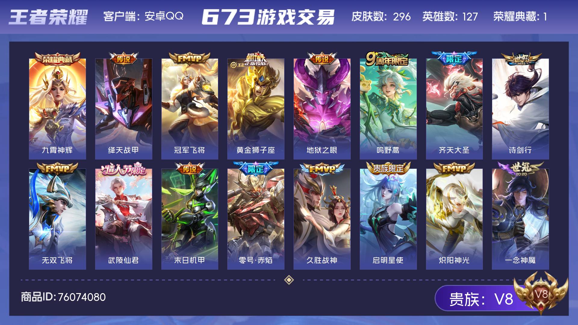 V8 皮肤296 英雄127 非凡王者 荣耀典藏1 星传说2 传说18 其他皮肤282