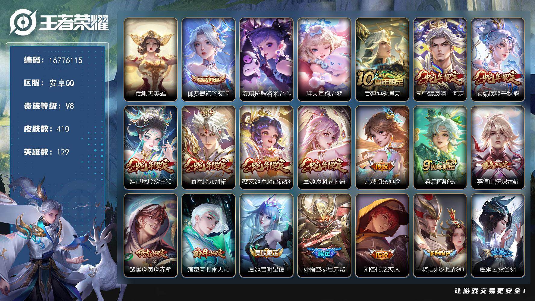 【16776115】安卓Q-V8-最强王者段位-129英雄-410皮肤-1典藏