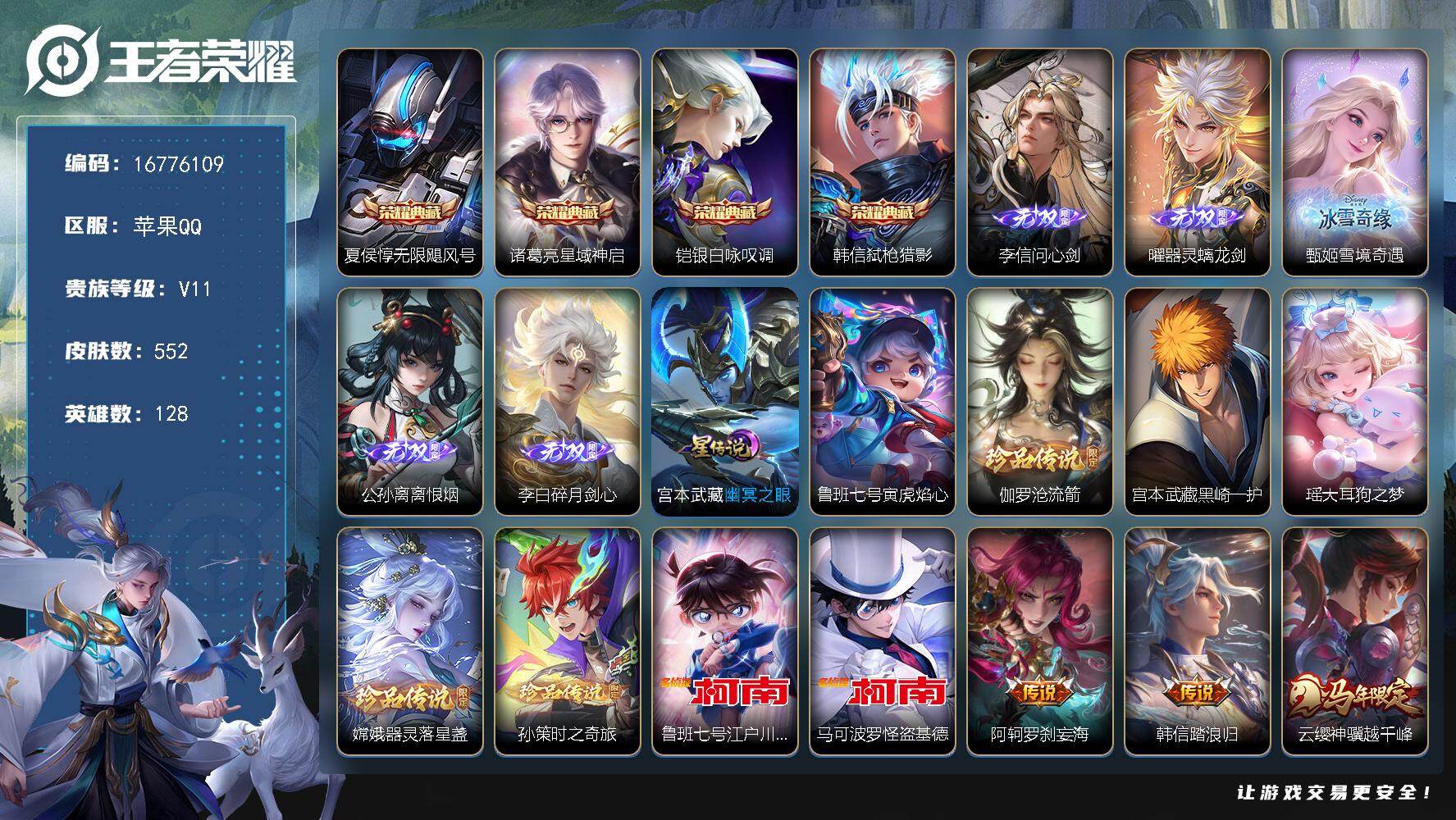 【16776109】苹果Q-V11-最强王者段位-128英雄-552皮肤-4典