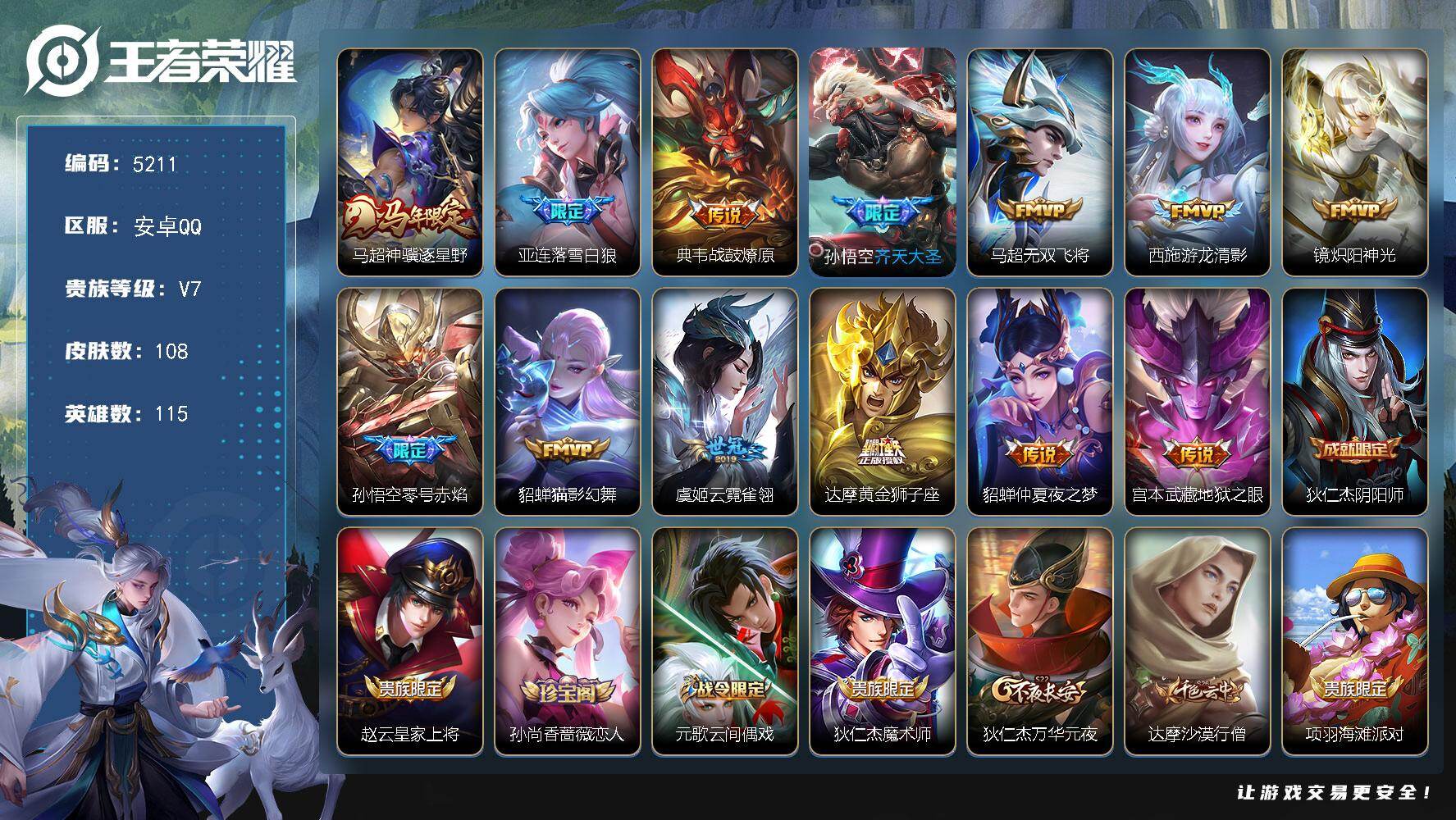 安卓Q-V7-最强王者段位-115英雄-108皮肤-13传说-30史诗【传说