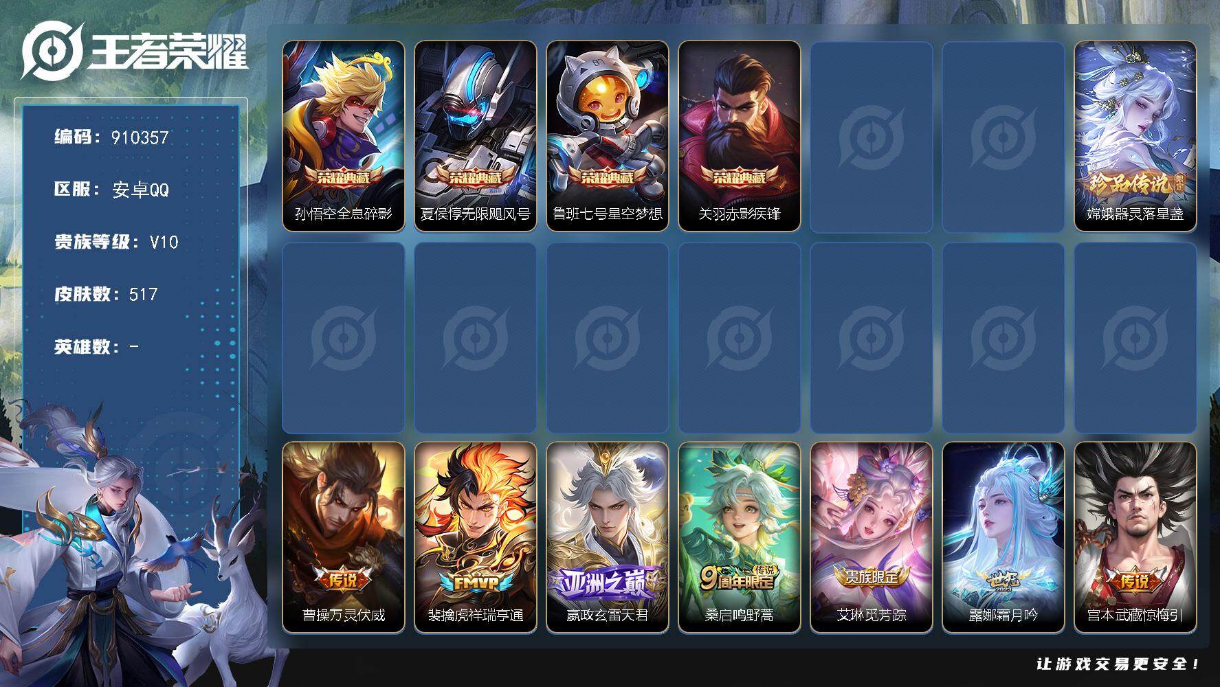 【V10 517皮肤4水晶1无双2星元2珍品78传说可秒换绑】安卓QQ-128英