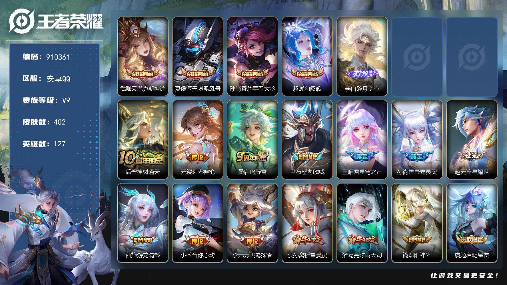 可二次【V9 402皮肤5水晶1无双2星元20传说3天幕可秒换绑】安卓QQ-12