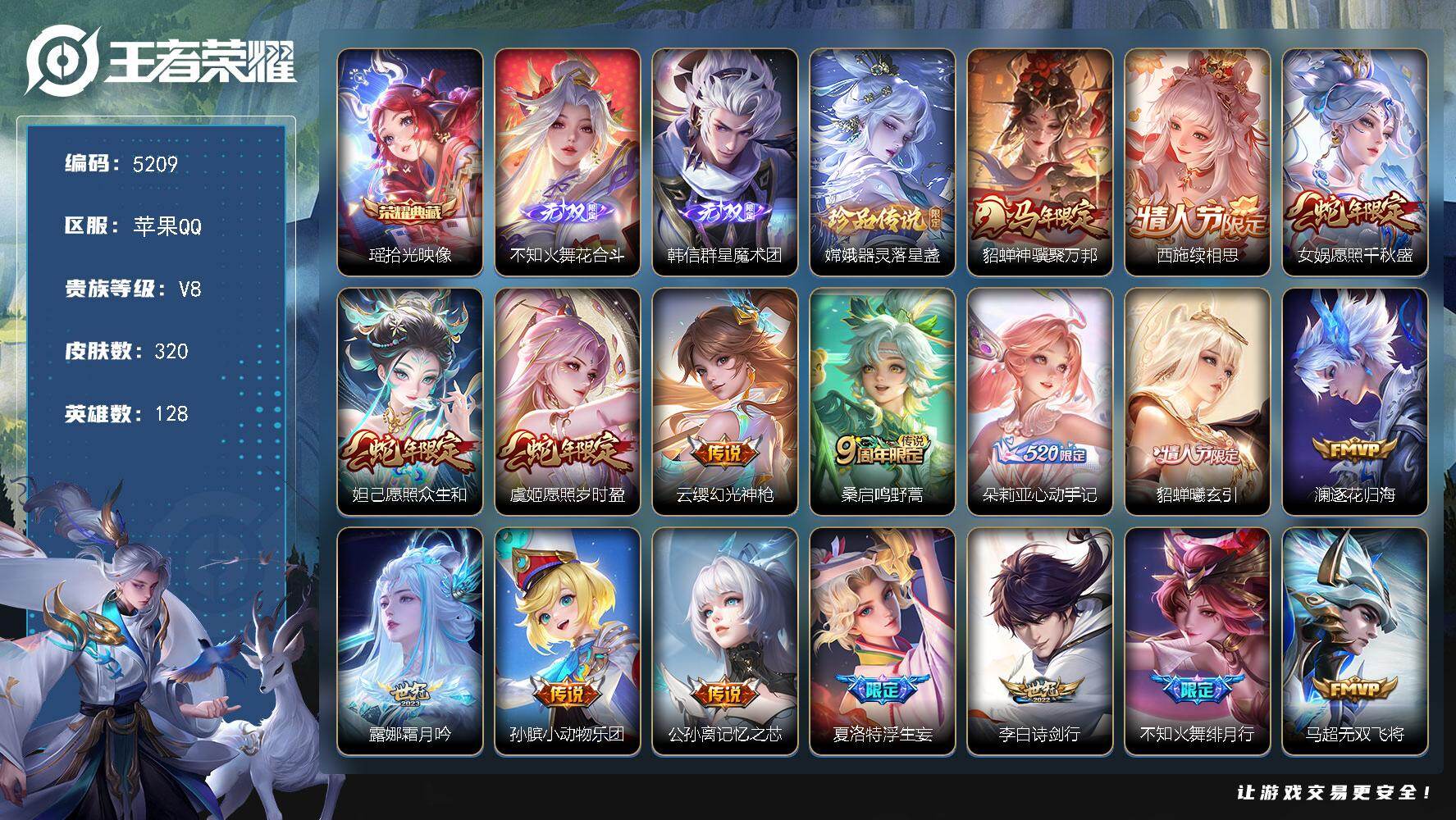 苹果Q-V8-最强王者段位-128英雄-320皮肤-1典藏皮肤-2无双-1珍品