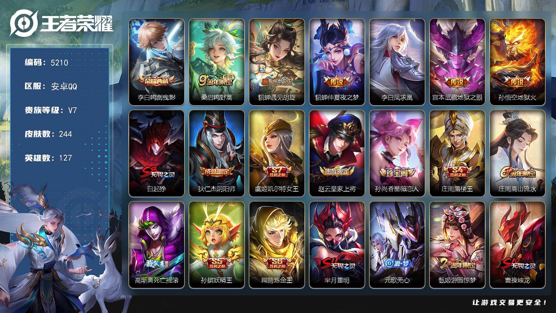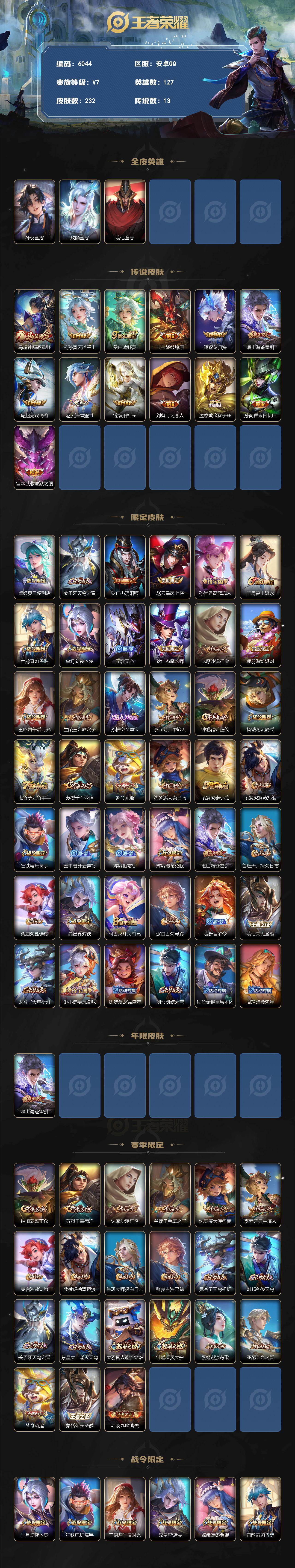 安卓Q-V7-最强王者段位-127英雄-244皮肤-1典藏皮肤-6传说-61史