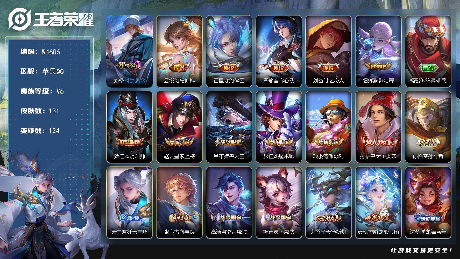 【W4606】苹果Q区-无二次-贵6-124英雄-131皮肤-5传说-33史诗