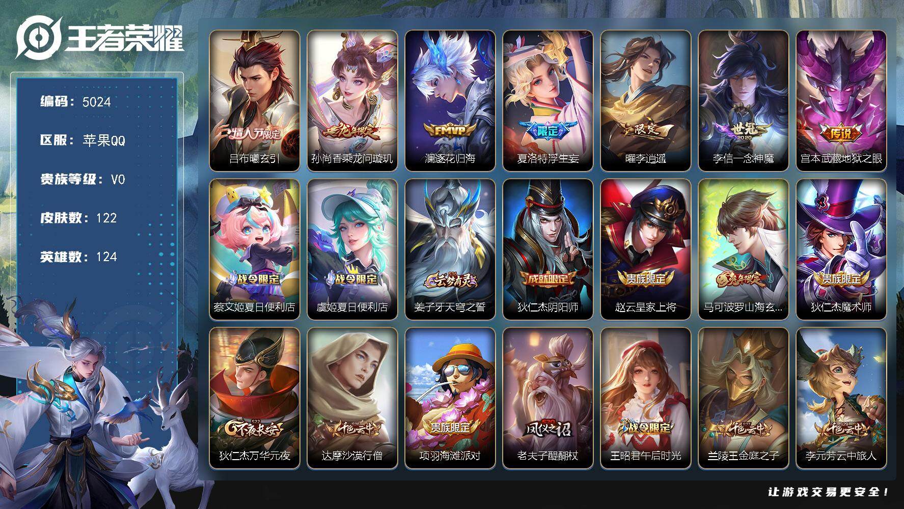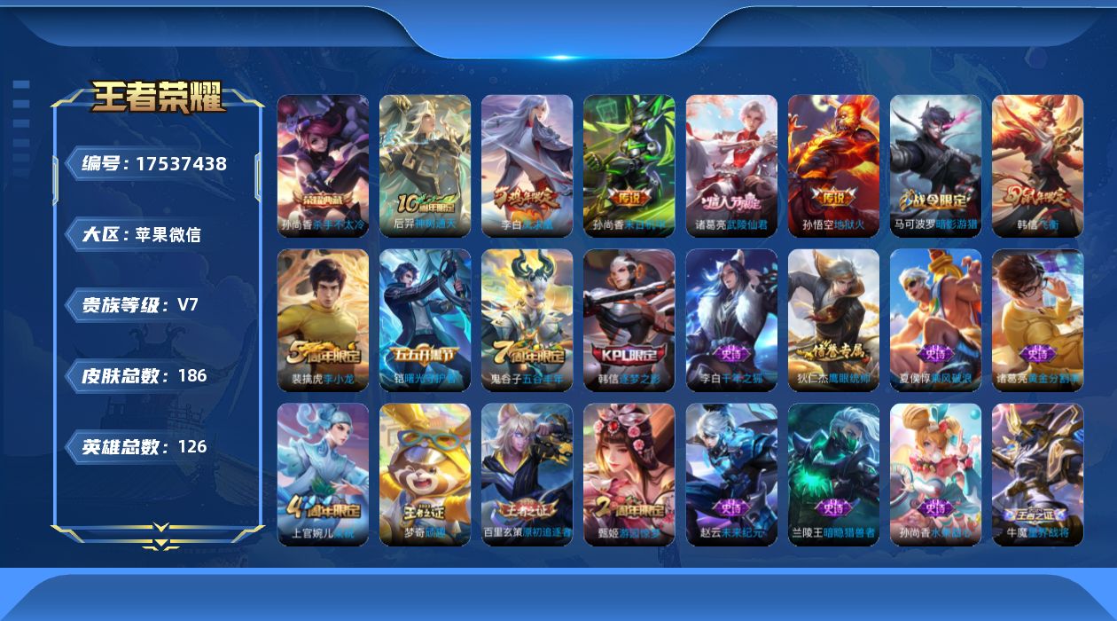 苹果Q-V0-尊贵铂金I段位-124英雄-122皮肤-7传说-23史诗【传说