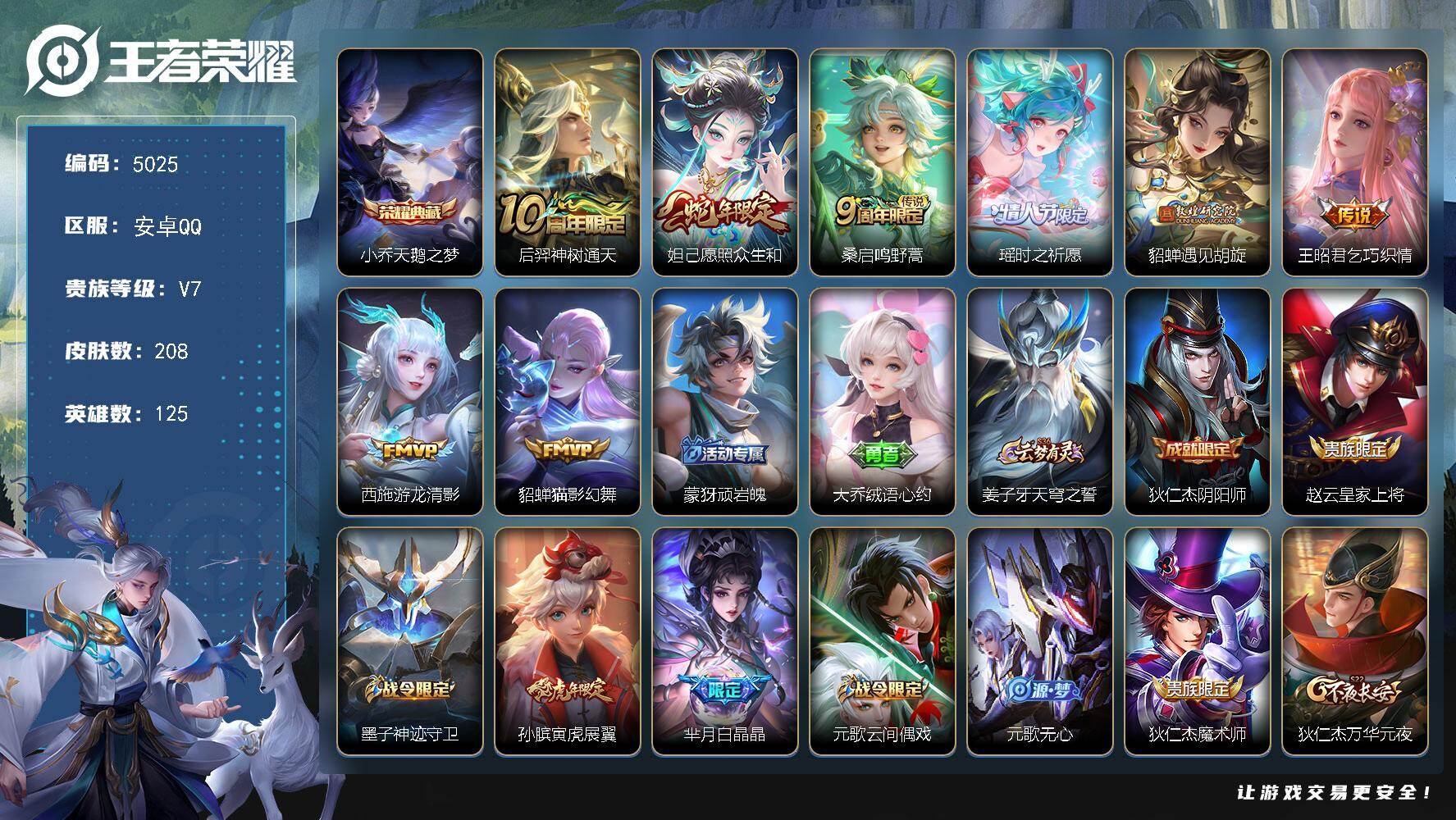 安卓Q-V7-荣耀黄金II段位-125英雄-208皮肤-1典藏皮肤-8传说-5